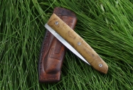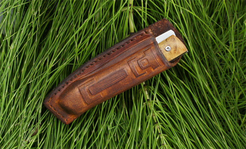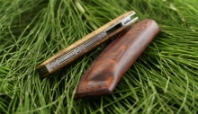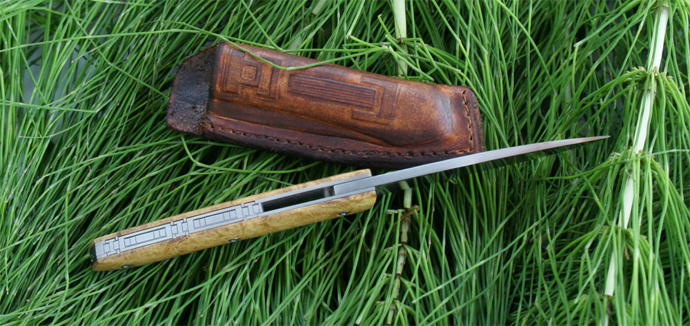 Lame inoxydable RWL34 – plaquettes en loupe de robinier (faux acacia) – platines titane – guillochage.