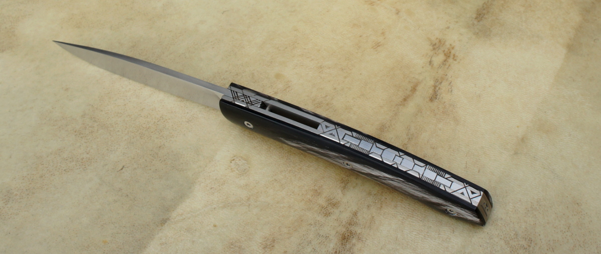Treyssac Corne de Buffle et 14c28n Post author:cyrilka Post published:2 mars 2016 Post category:Couteaux / Couteaux pliants / Treyssac Post comments:0 commentaire Couteau de type liner lock. Lame 14c28N – plaquettes corne de Buffle – platines titane – guillochage Longueur de lame : 8,8 cm. Longueur totale : 19,5 cm. Tags: 14c28n, artisanal, chenailler, chenailler mascheix, corne de buffle, corrèze, couteau, coutellerie, cyril kalisz, demontable, guillochage, inox, inoxydable, kalisz, liner, Liner lock, mascheix, titane, Treyssac Read more articles Article précédentReka Noyer et XC100 Article suivantReka Ebène & RWL34 Vous devriez également aimer Reka Ebène & RWL34 1 avril 2016 Couteau droit – XC100 et Buis 12 mai 2016 Reka 90McV8 & Bouleau 21 août 2016 Laisser un commentaire Annuler la réponseCommentEnter your name or username to comment Enter your email address to comment Enter your website URL (optional) Enregistrer mon nom, mon e-mail et mon site dans le navigateur pour mon prochain commentaire. Je m'inscrit à la liste d'informations Δ Ce site utilise Akismet pour réduire les indésirables. En savoir plus sur comment les données de vos commentaires sont utilisées.