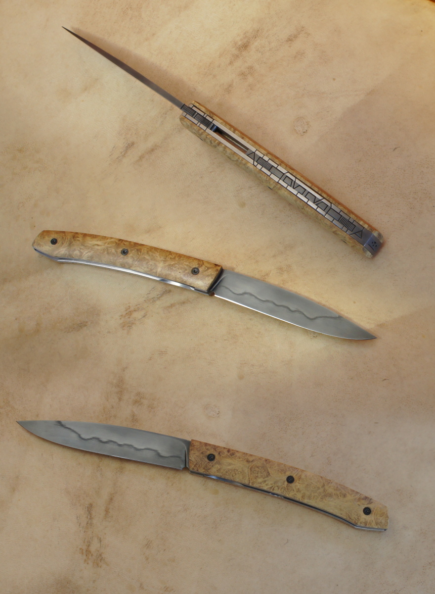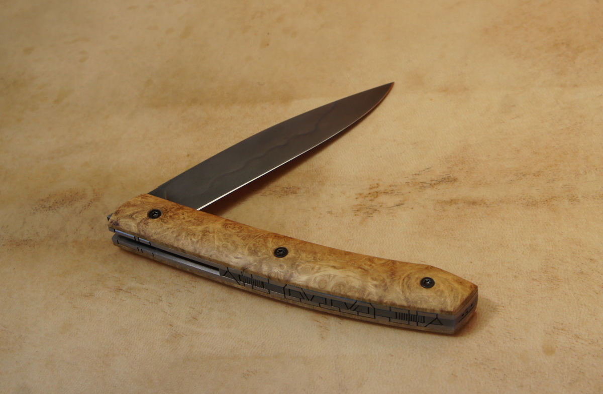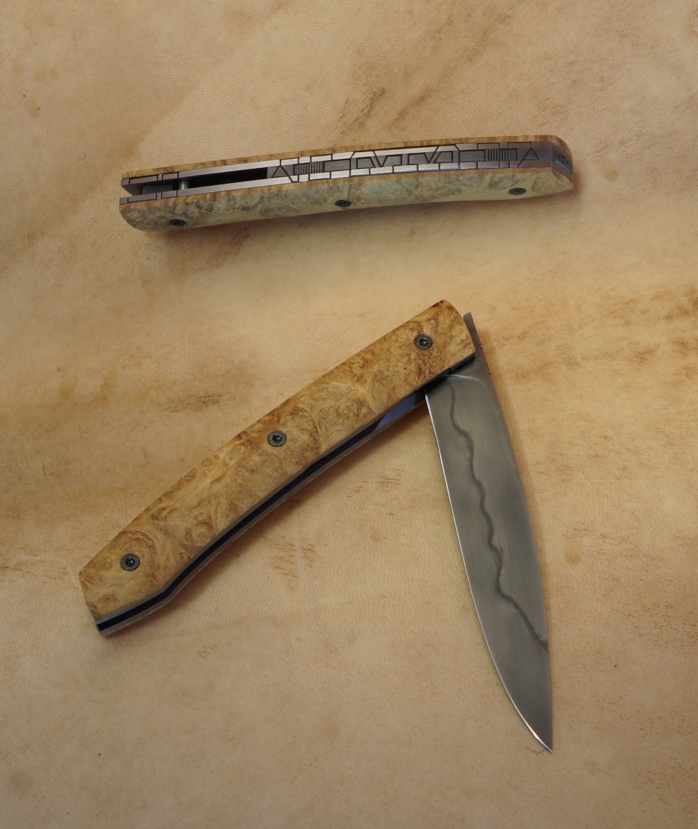 Treyssac XC100 et Robinier Post author:cyrilka Post published:6 mai 2016 Post category:Couteaux / Couteaux pliants / Treyssac Post comments:0 commentaire Couteau de type liner lock. Lame XC100 trempe sélective – plaquettes Robinier – vis noires – platines titane – guillochage Longueur de lame : 8,9 cm. Longueur totale : 19,4 cm. Tags: artisanal, chenailler, chenailler mascheix, corrèze, couteau, coutellerie, cyril kalisz, demontable, guillochage, inox, inoxydable, kalisz, liner, Liner lock, mascheix, robinier, titane, trempe selective, Treyssac, vis noir, XC100 Read more articles Article précédentReka Ebène & RWL34 Article suivantReka Buis et Niolox Vous devriez également aimer Oiseleur 125SC & bois de cerf 14 mars 2019 Treyssac RWL34 & Buis – BdB anti-rayure 25 novembre 2016 Reka – Buis & RWL34 – guillochage 4 éléments 26 novembre 2015 Laisser un commentaire Annuler la réponseCommentEnter your name or username to comment Enter your email address to comment Enter your website URL (optional) Enregistrer mon nom, mon e-mail et mon site dans le navigateur pour mon prochain commentaire. Je m'inscrit à la liste d'informations Δ Ce site utilise Akismet pour réduire les indésirables. En savoir plus sur comment les données de vos commentaires sont utilisées.