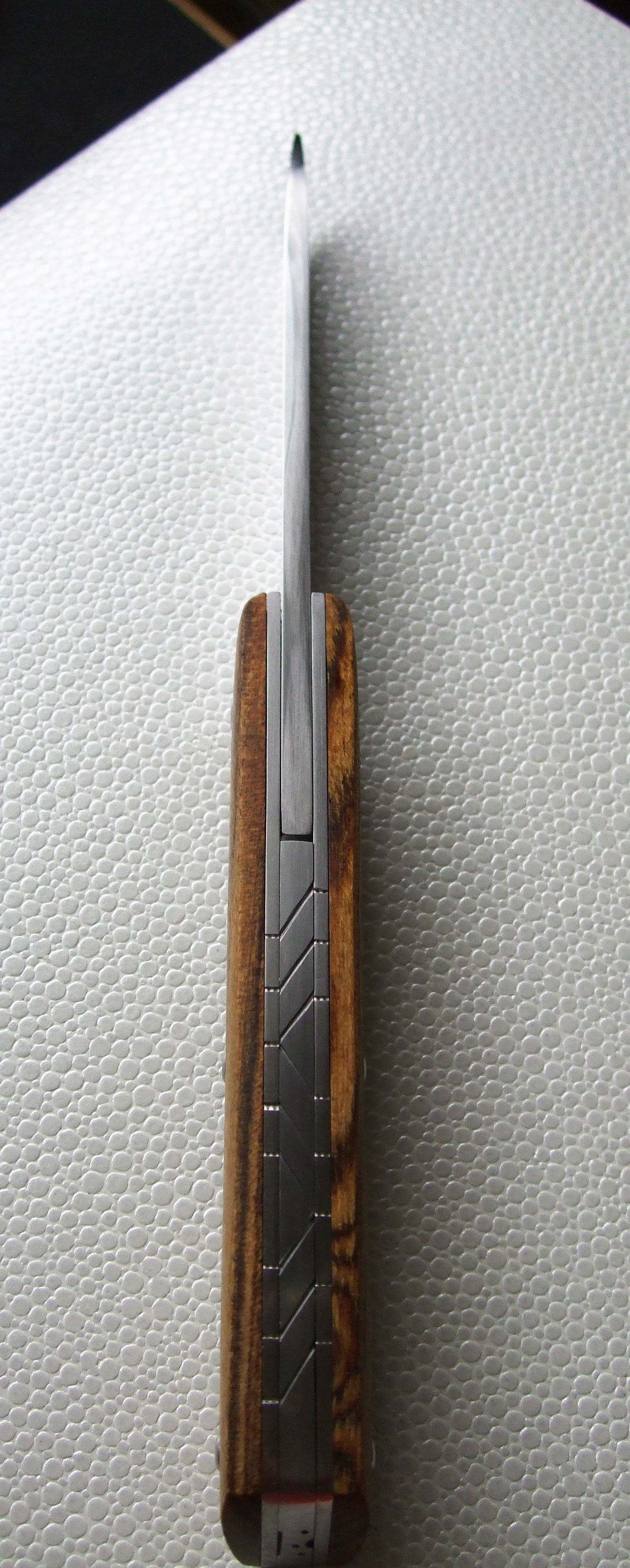 Lame en 440C (1.1425 / X105CrMo17) – manche en Bogotte – liner en titane – guillochage incas 01.