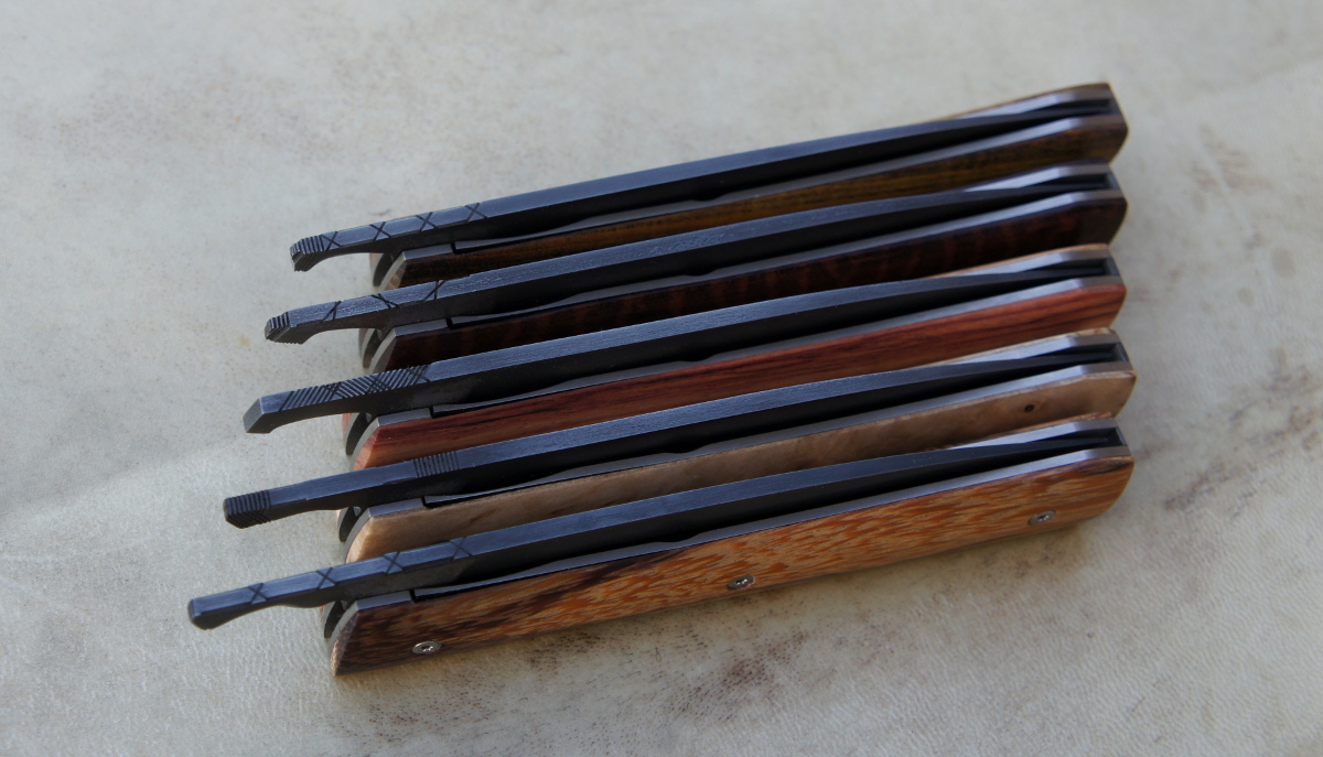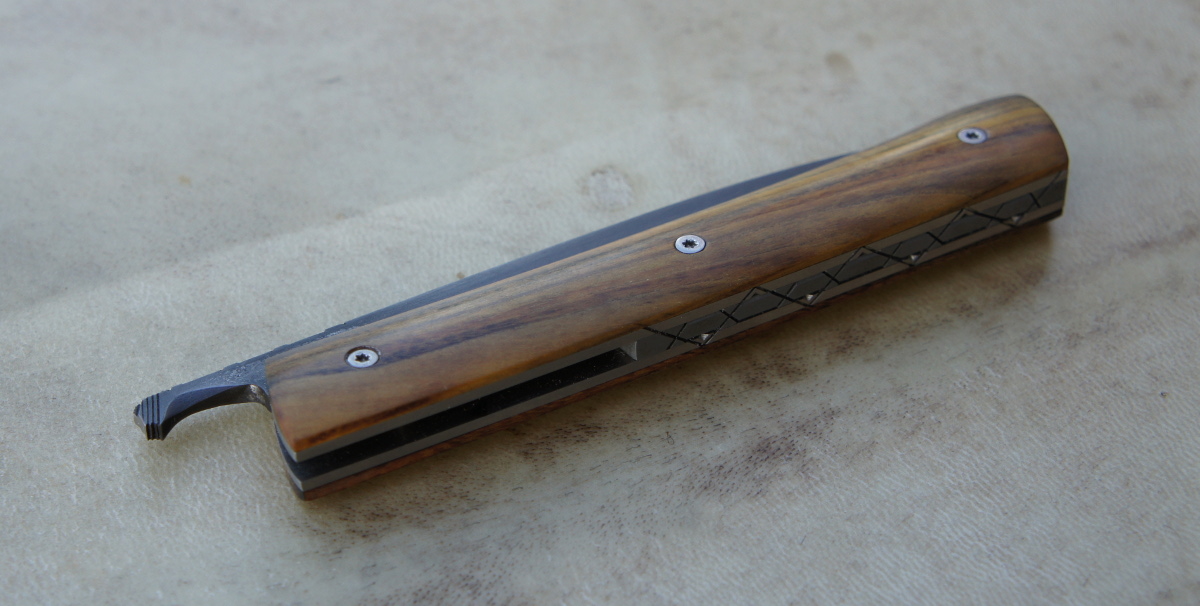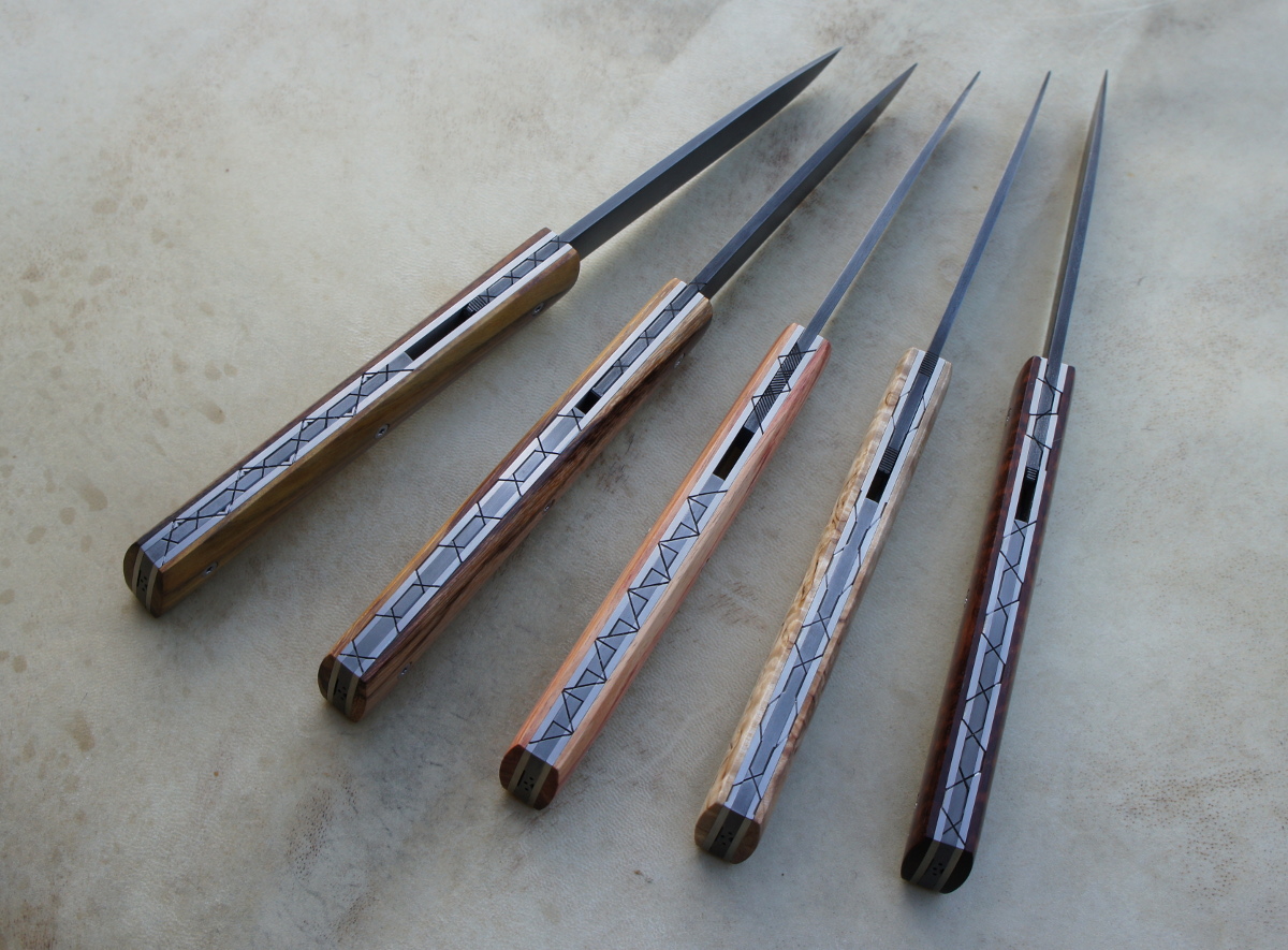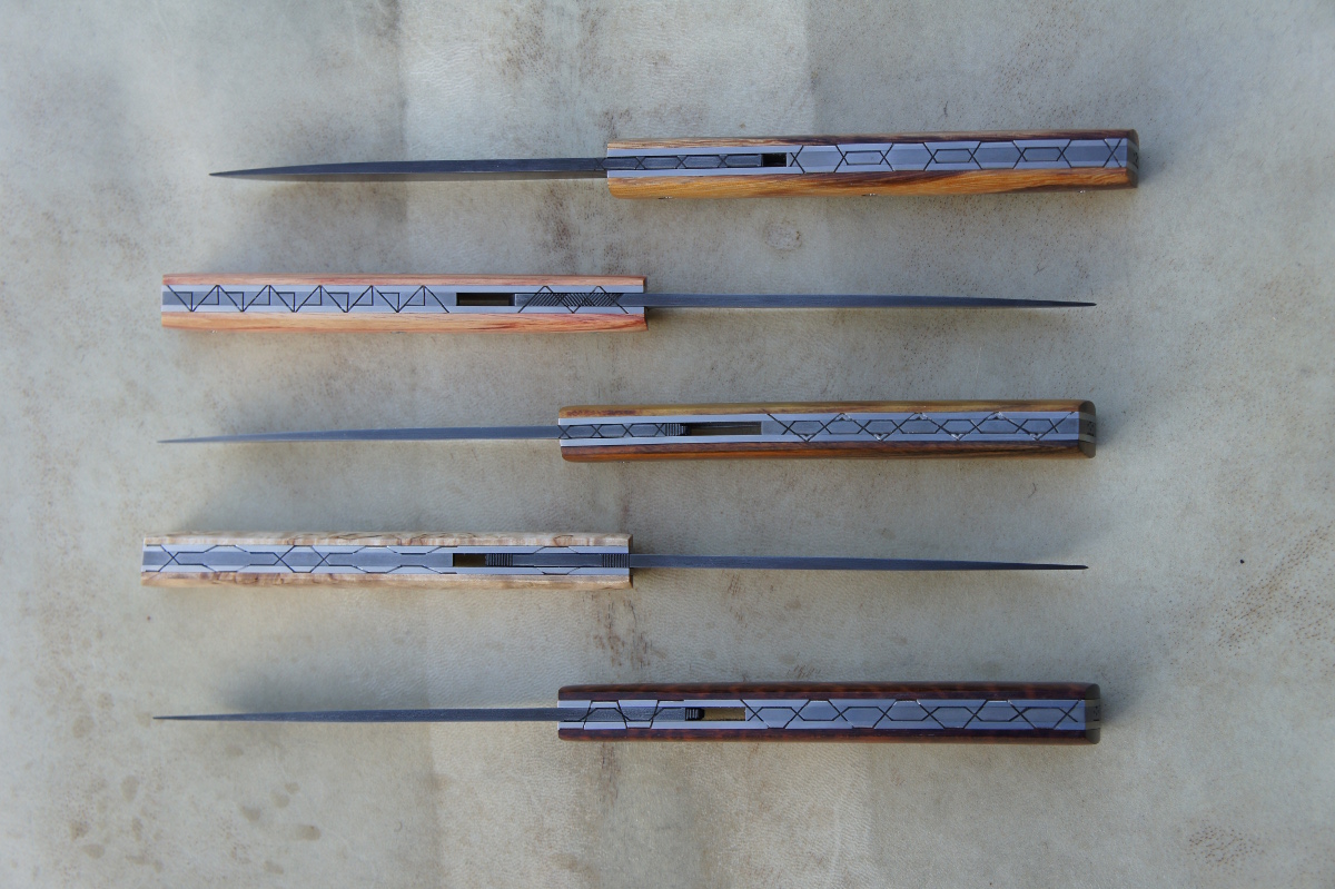 Lames 90MCV8 patinées – plaquettes bouleau madré de norvège – bois de serpent – bois de rose – amourette – pistachier – platines titane – guillochage