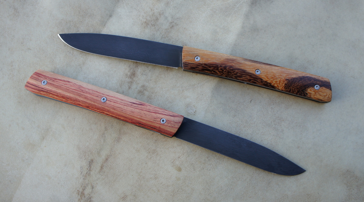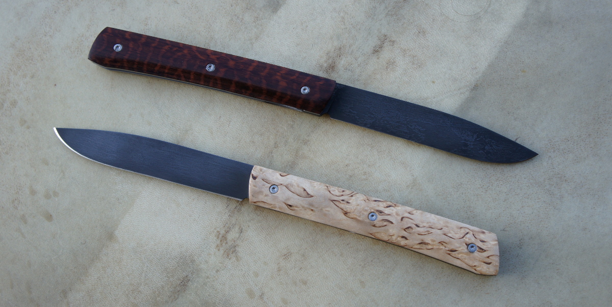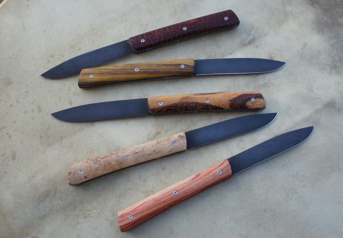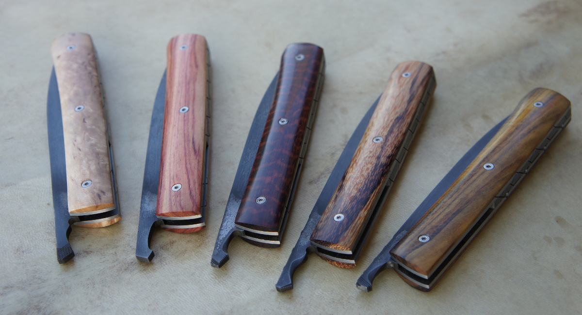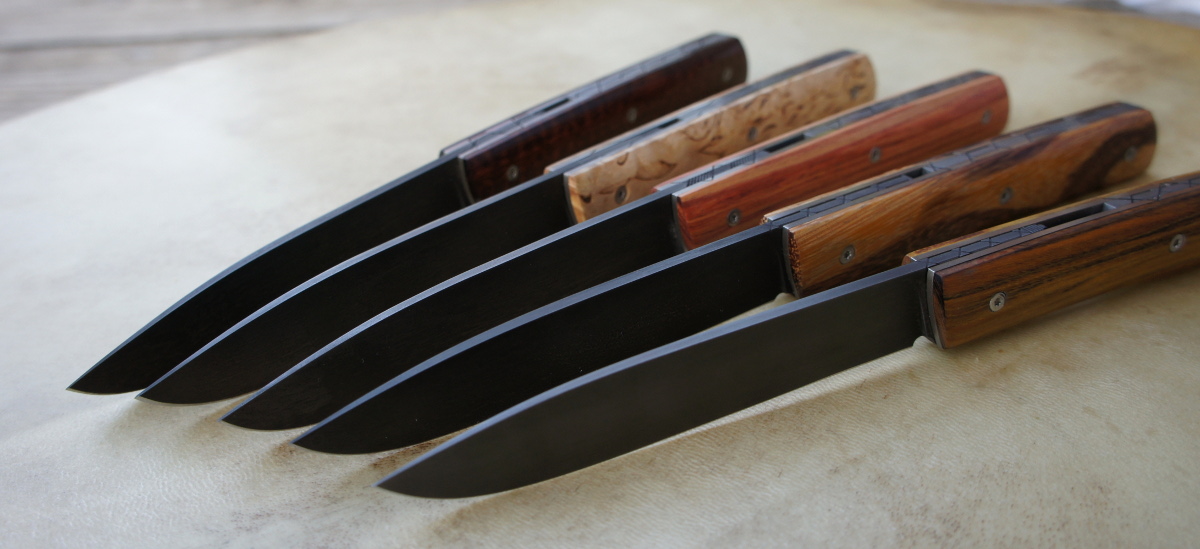 Lames 90MCV8 patinées – plaquettes bouleau madré de norvège – bois de serpent – bois de rose – amourette – pistachier – platines titane – guillochage