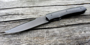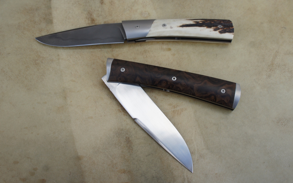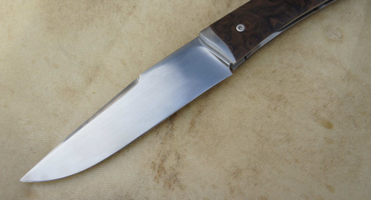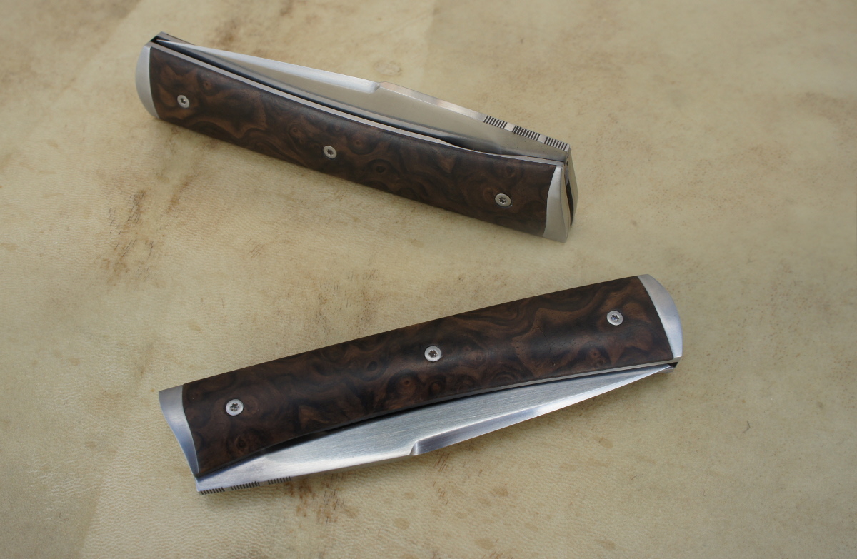 Lame inoxydable 14c28n – plaquettes loupe de noyer stabilisée – platines titane – guillochage – doubles mitres fines
