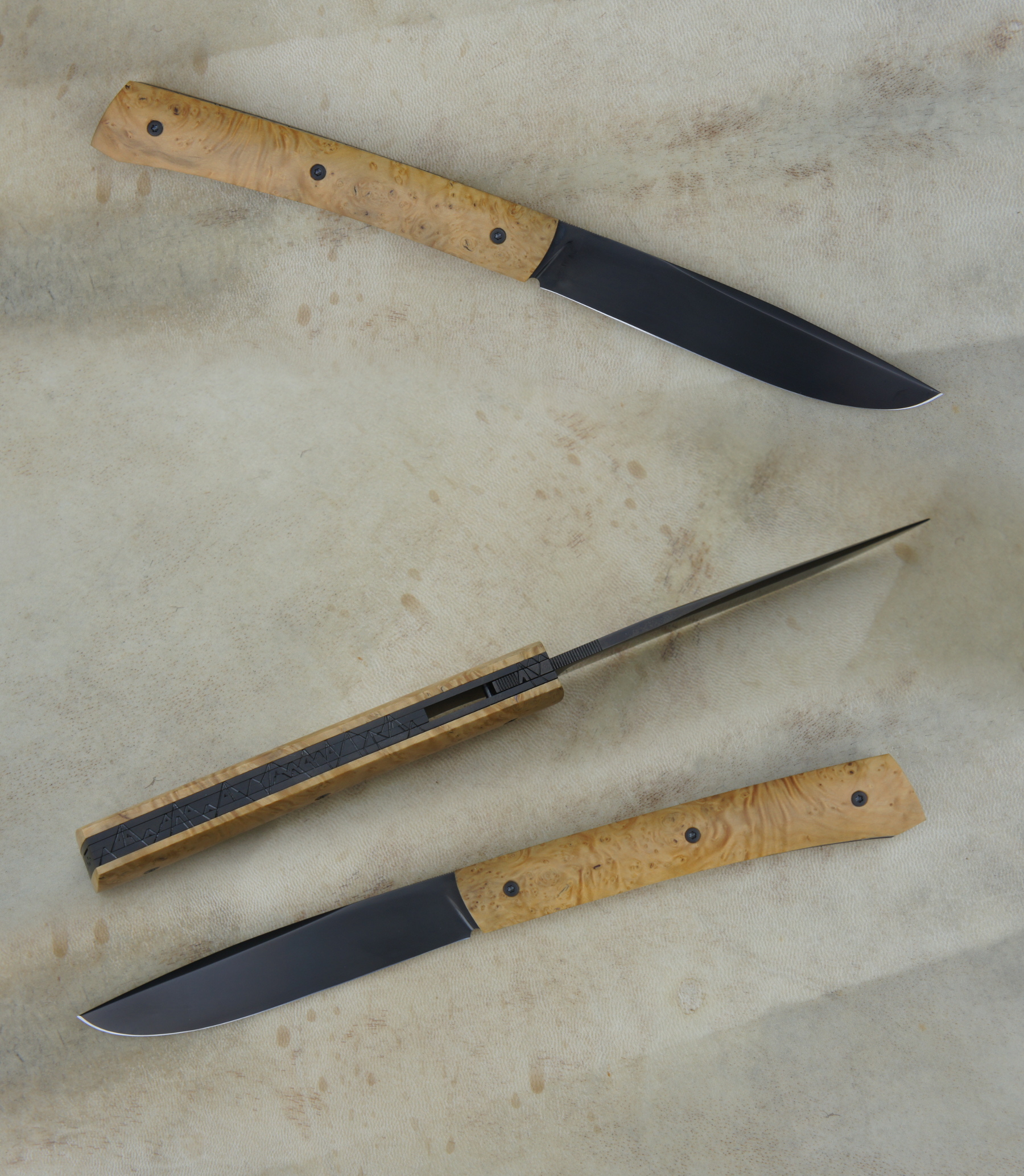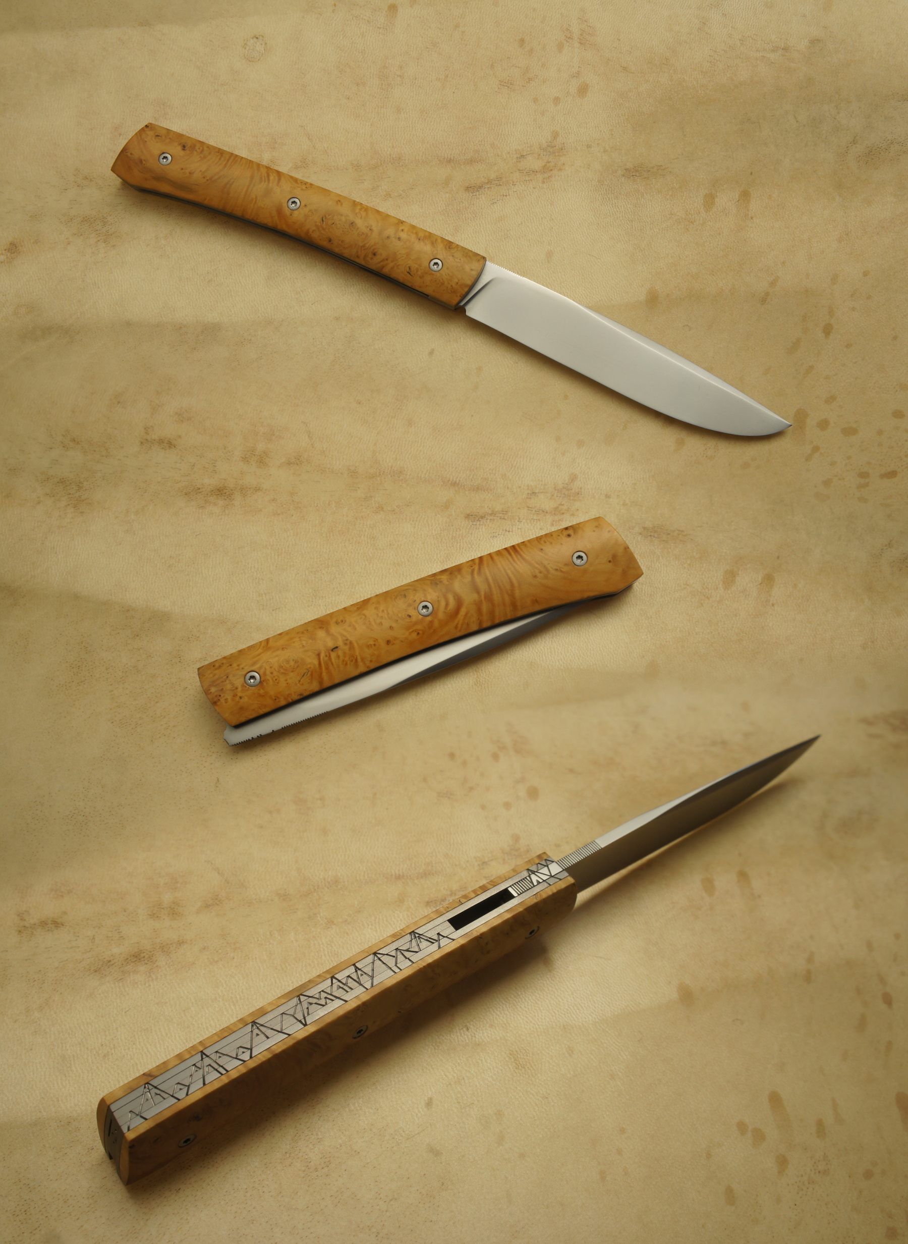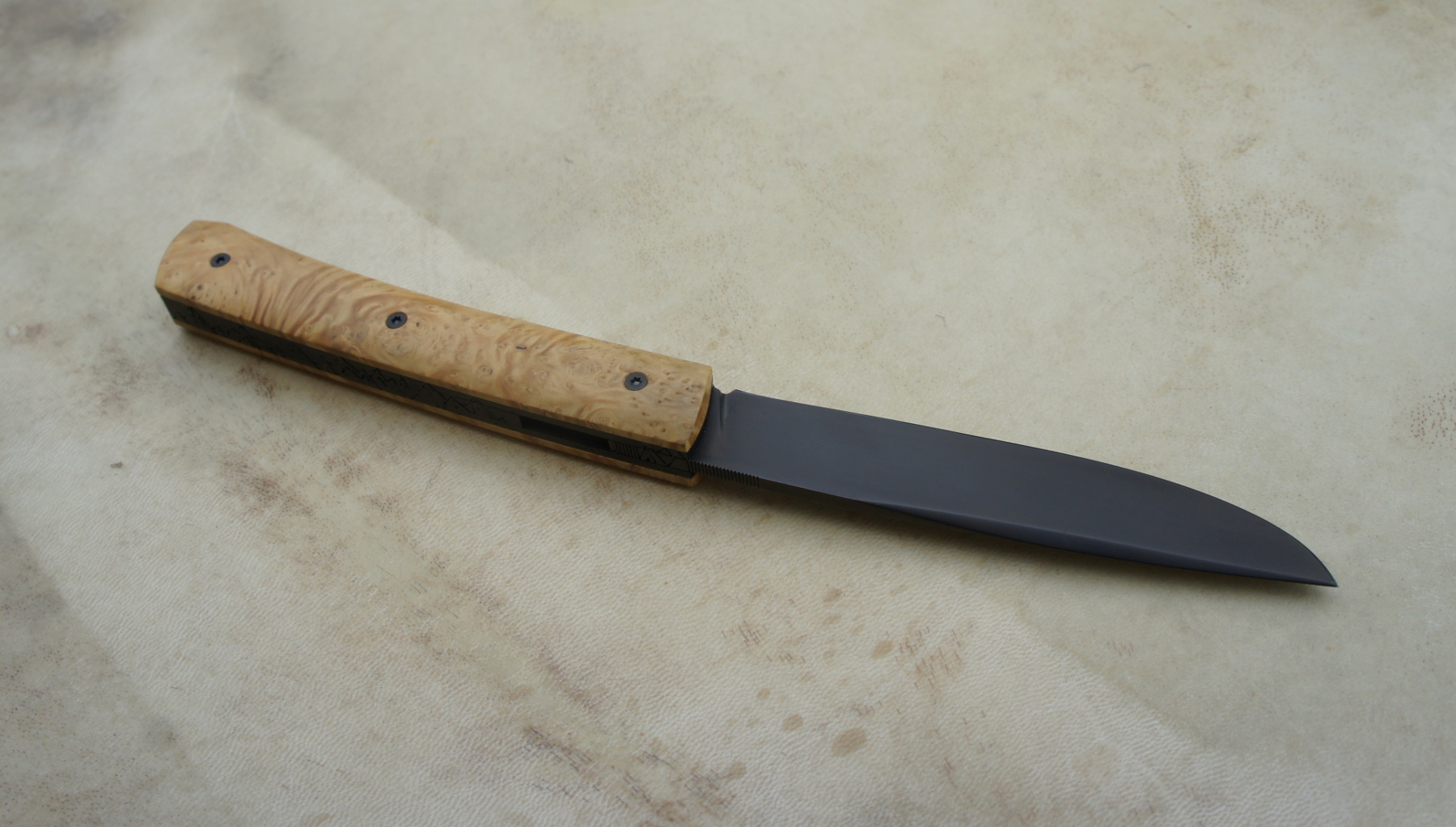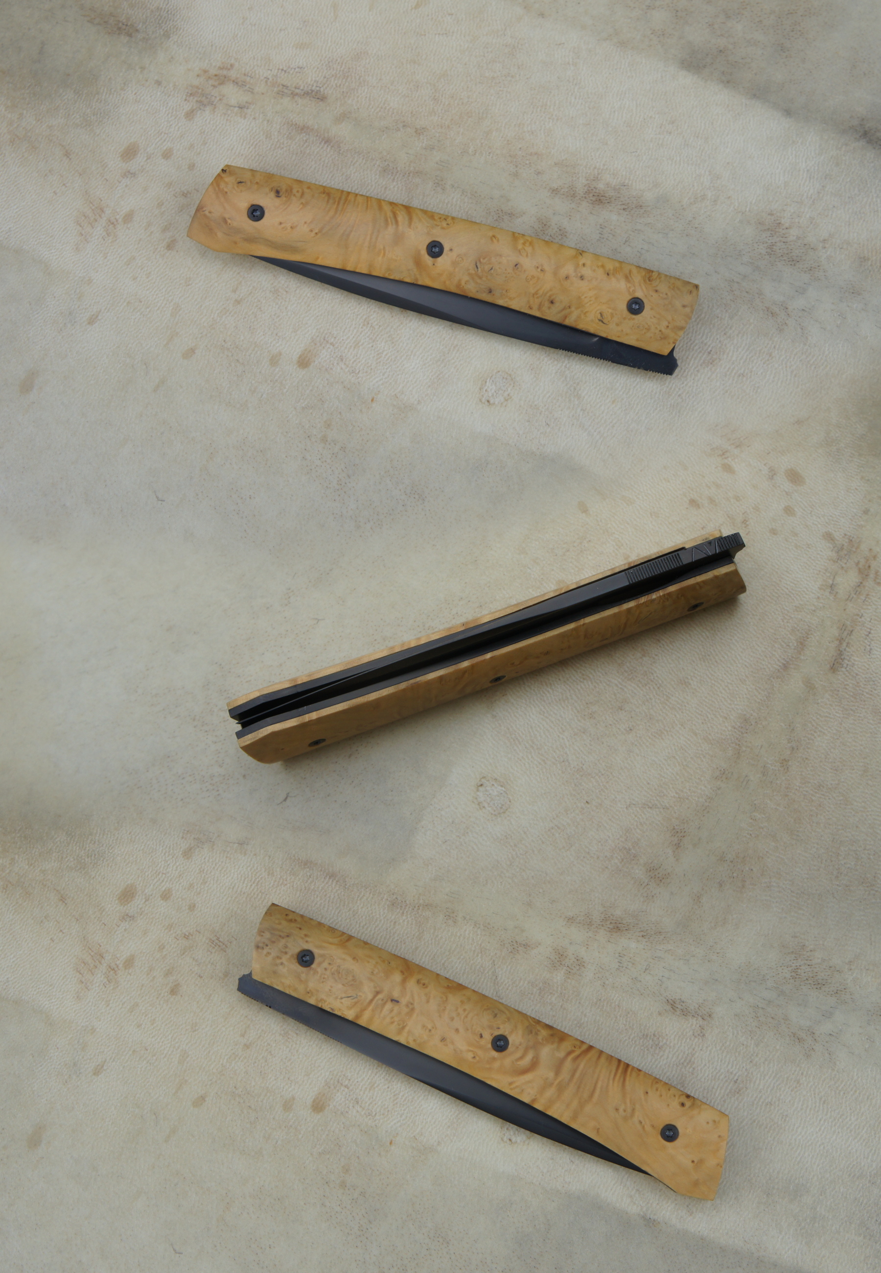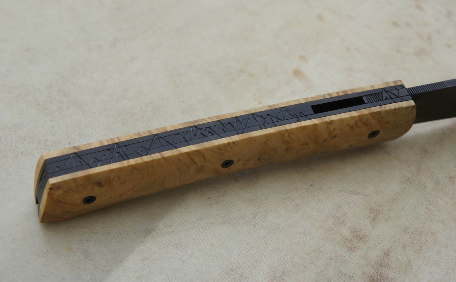 Lame inoxydable 14c28n – plaquettes loupe de buis stabilisée – platines titane – guillochage montagne – traitement anti-rayure Bailinite Deep Black « BdB » – ouverture LIP