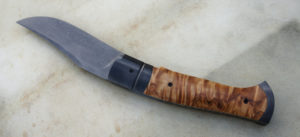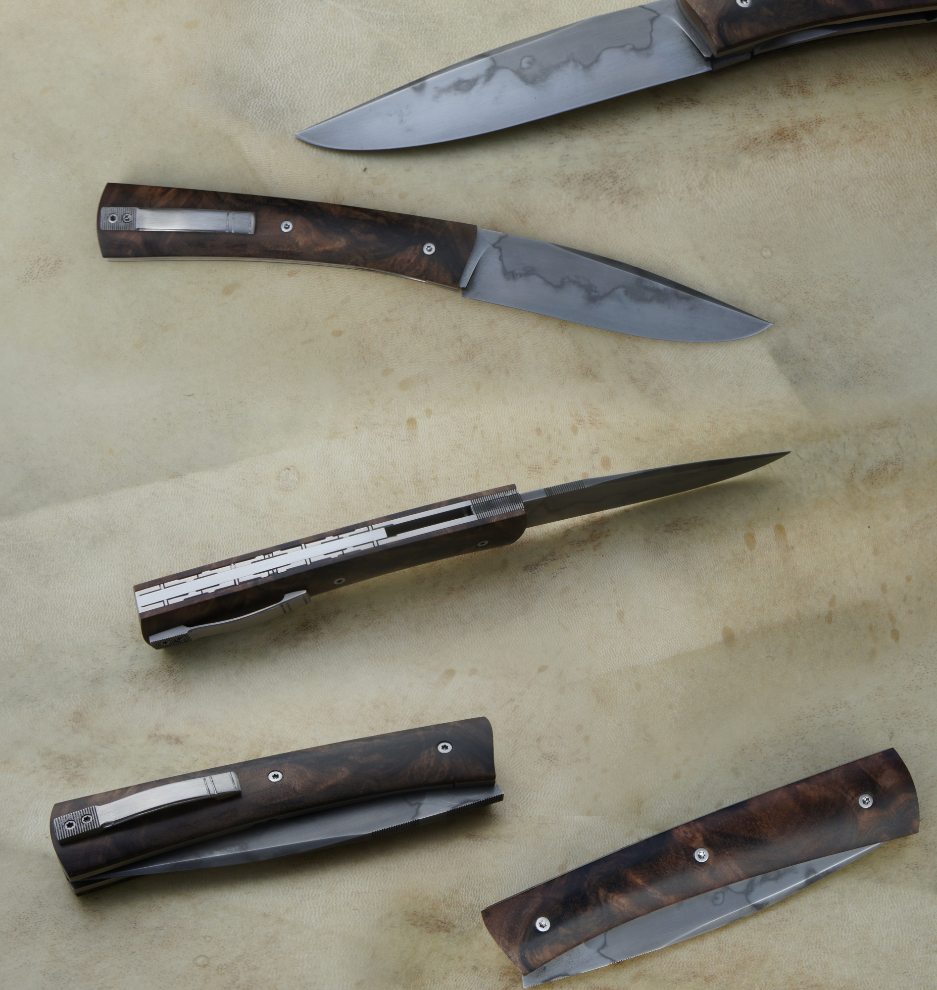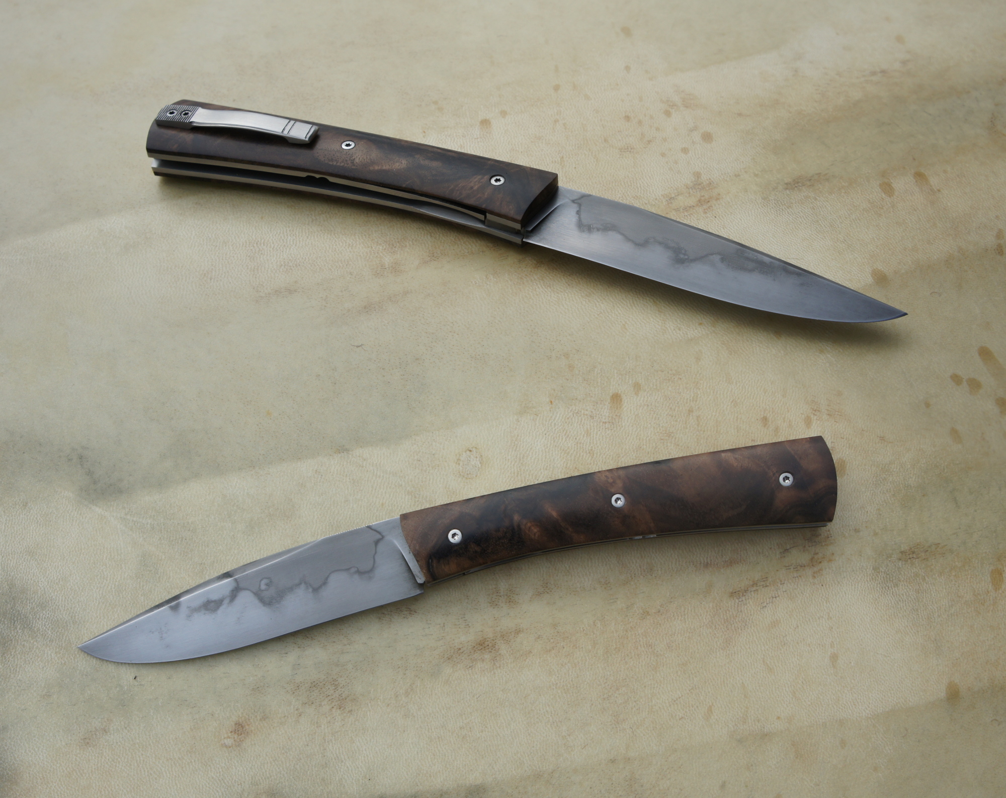 Lame carbone 125SC trempe sélective – plaquettes loupe de noyer stabilisée – platines titane – clip ceinture –  guillochage
