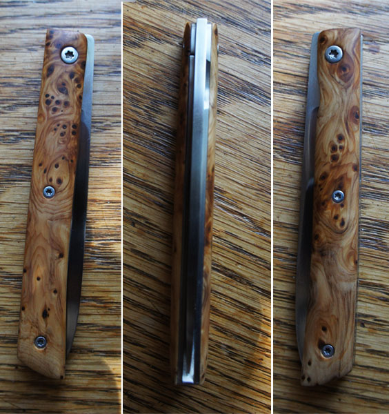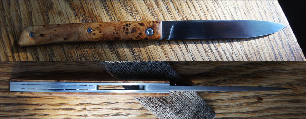 P’tit de Poche – If Post author:cyrilka Post published:4 octobre 2011 Post category:Couteaux / Couteaux pliants / P'tit de Poche Couteau de type liner lock. Lame RWL34 – manche If – guillochage incas. Longueur de lame : 9,1cm. Longueur totale : 20cm. Disponible sur commande. Tags: acier des poudres, couteau, couteau pliant, coutellerie, cyril kalisz, guillochage, if, inox, inoxydable, kalisz, Liner lock, P'tit de poche, RWL34, Z20Cr13 Read more articles Article précédentPlanKa – Bois de Fer Article suivantLinerKa If Vous devriez également aimer Reka – Buis & RWL34 – guillochage 4 éléments 26 novembre 2015 Treyssac XL 14c28N & Noyer stabilisé 23 juin 2017 Nomade suminagashi Aura & châtaigner ondé 28 octobre 2020