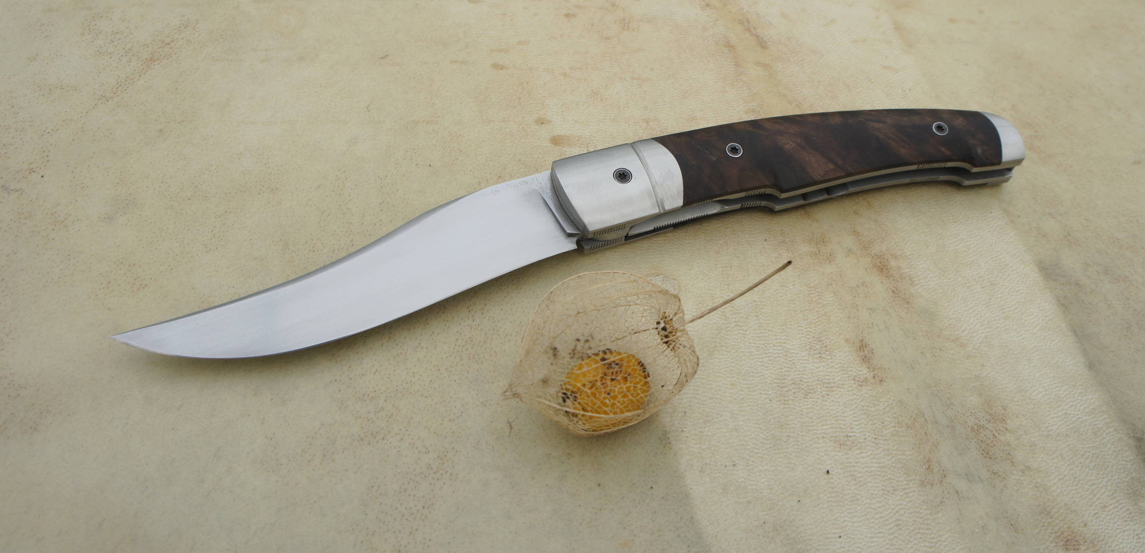 Michto 115W8 & Noyer Post author:cyrilka Post published:23 avril 2020 Post category:Couteaux / Couteaux pliants / Michto Post comments:0 commentaire Couteau pliant liner-lock Lame carbone 1.2442 115W8 – plaquettes noyer stabilisé – mitres inox trempées – platines titane – guillochageLongueur de lame : 92 mm.Longueur totale : 199 mm. Vendu Tags: 1.2442, 115w8, artisanal, chenailler, chenailler mascheix, correze, corrèze, couteau, coutellerie, cyril kalisz, demontable, guillochage, inox, inoxydable, kalisz, liner-lock, michto, mitres, noyer stabilisé, titane Read more articles Article précédentOiseleur damas plume & bois de renne Article suivantAlvilda Koa & SHV Vous devriez également aimer Reka 90McV8 & Bouleau 21 août 2016 Treyssac Fusion 14c28n & Genévrier – mitres fines 25 novembre 2017 Nomade Super Gold & ébène 10 novembre 2019 Laisser un commentaire Annuler la réponseCommentEnter your name or username to comment Enter your email address to comment Enter your website URL (optional) Enregistrer mon nom, mon e-mail et mon site dans le navigateur pour mon prochain commentaire. Je m'inscrit à la liste d'informations Δ Ce site utilise Akismet pour réduire les indésirables. En savoir plus sur comment les données de vos commentaires sont utilisées.