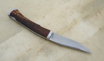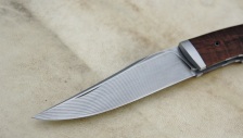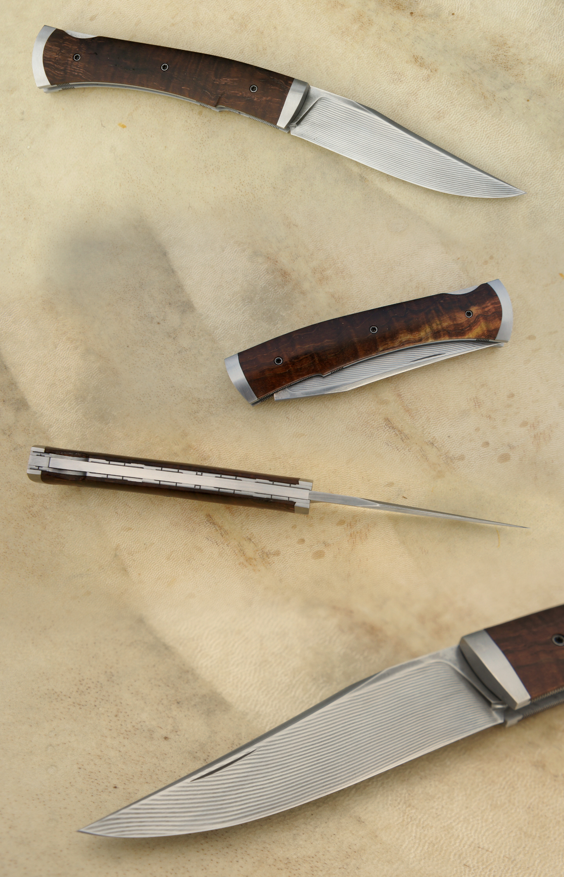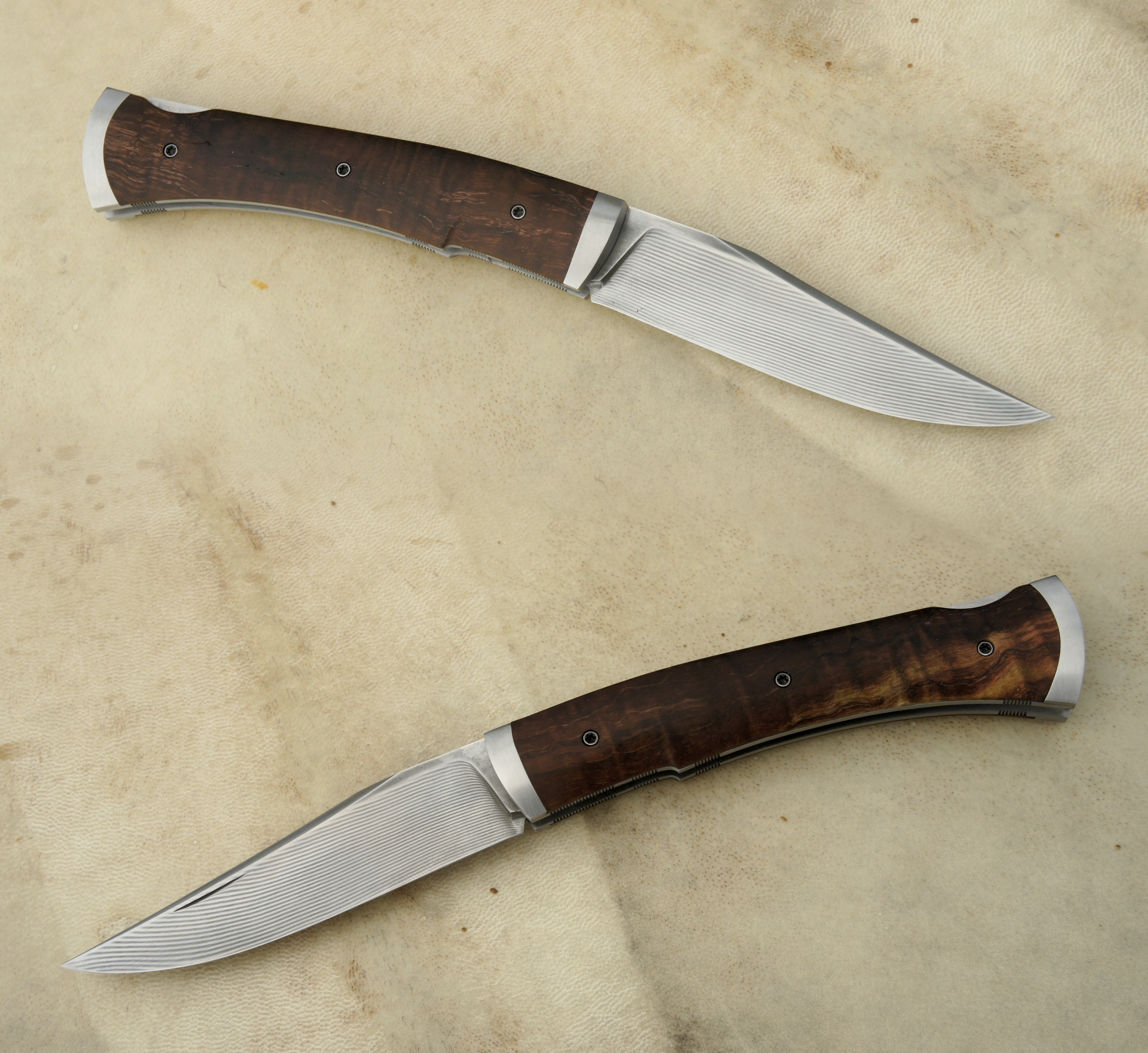 Lame inos suminagashi Aura N690Co & Nitro B – Trempe cryo – plaquettes châtaigner ondé stabilisé – platines inox – guillochage – mitres fines inox trempées parkérisées.