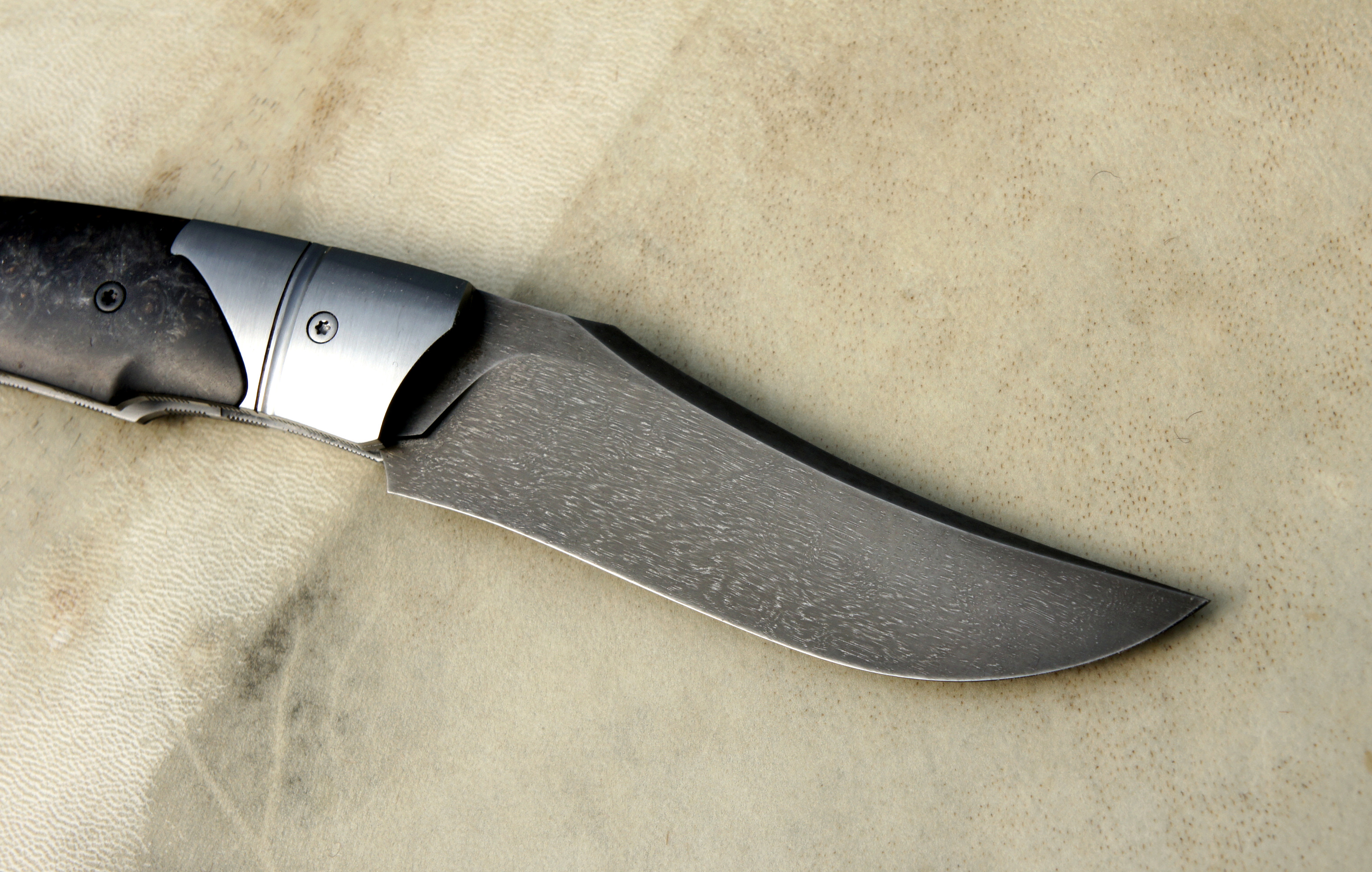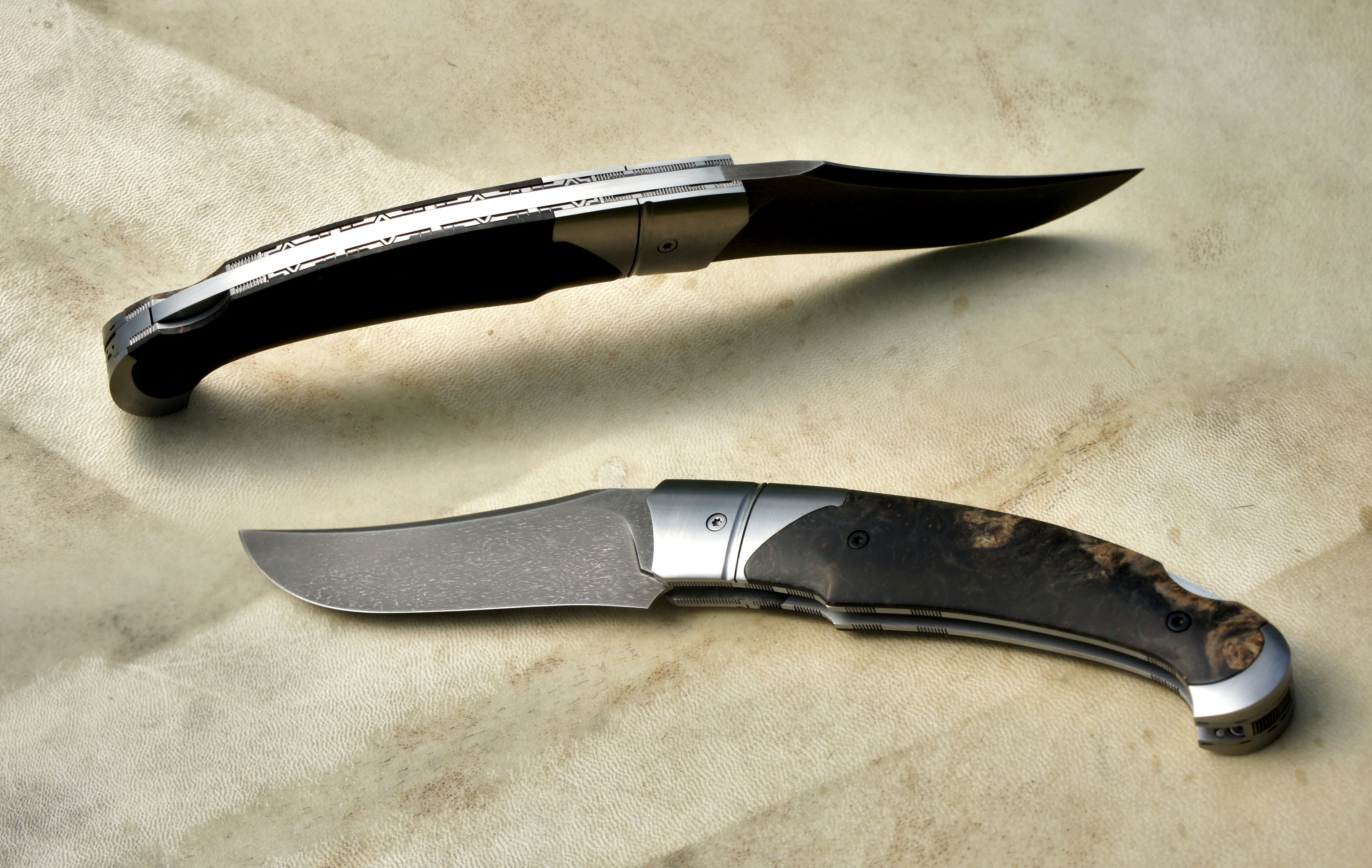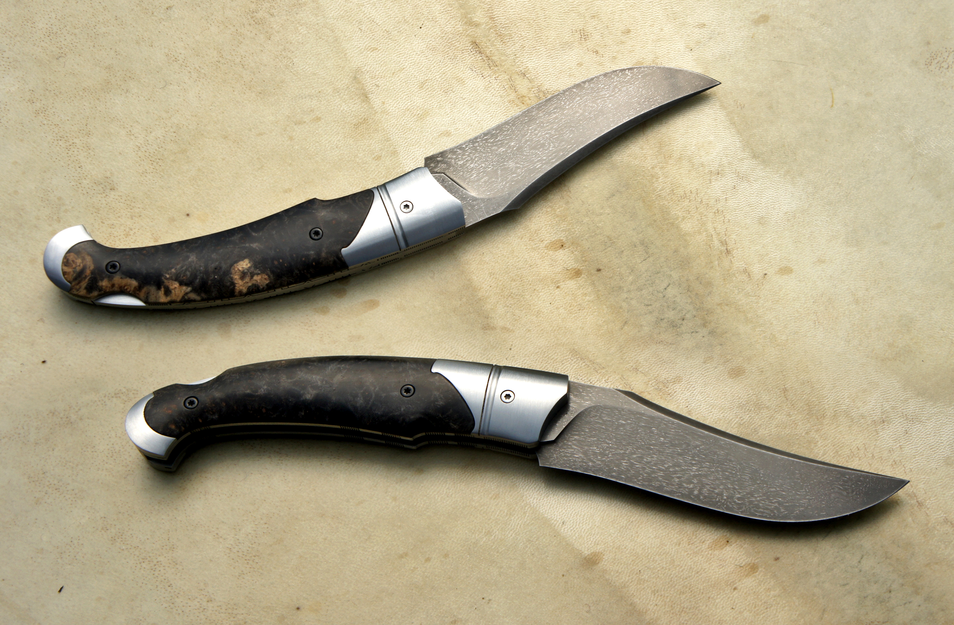 Lame wootz de Evrahim Bahran – plaquettes loupe d’amboine noire de chez NovaWood – platines inox – mitres inox trempées – guillochage