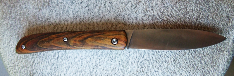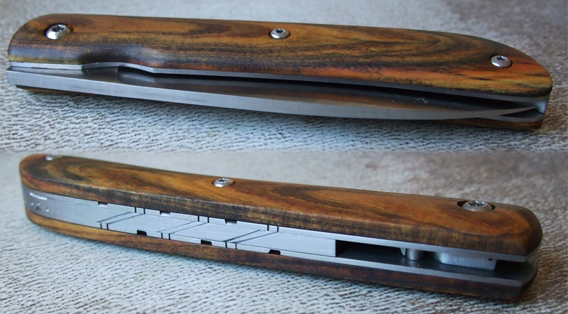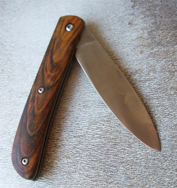 Couteau de type liner lock. Commande spécifique pour une facteur de clarinette, reproduction du Pistachier avec un système liner lock.
