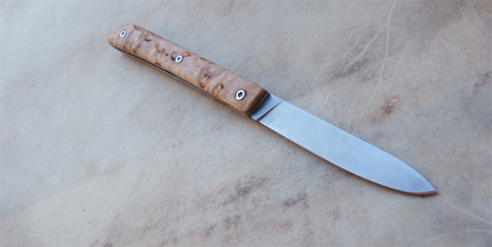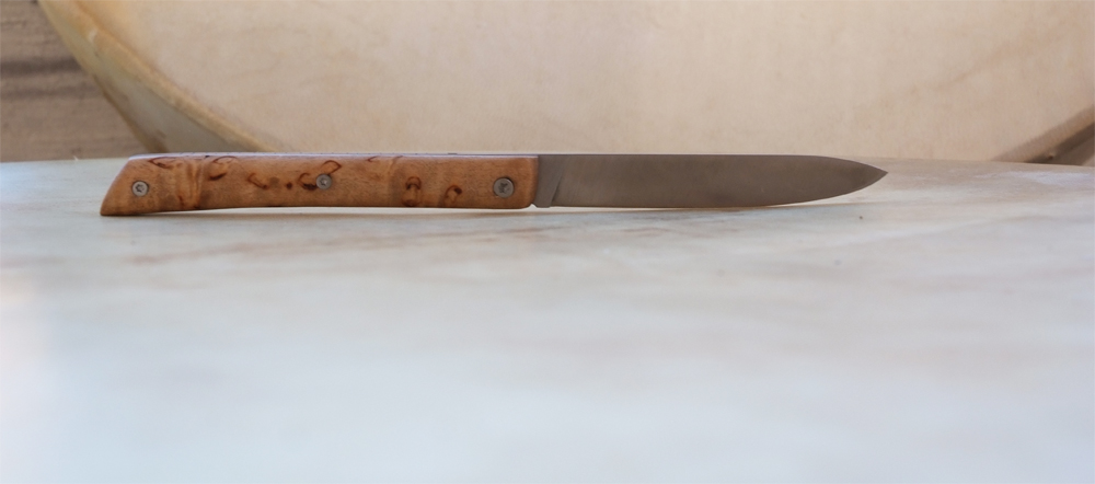 Lame D2 – Plaquettes en Bouleau madré – liner en titane – guillochages incas.