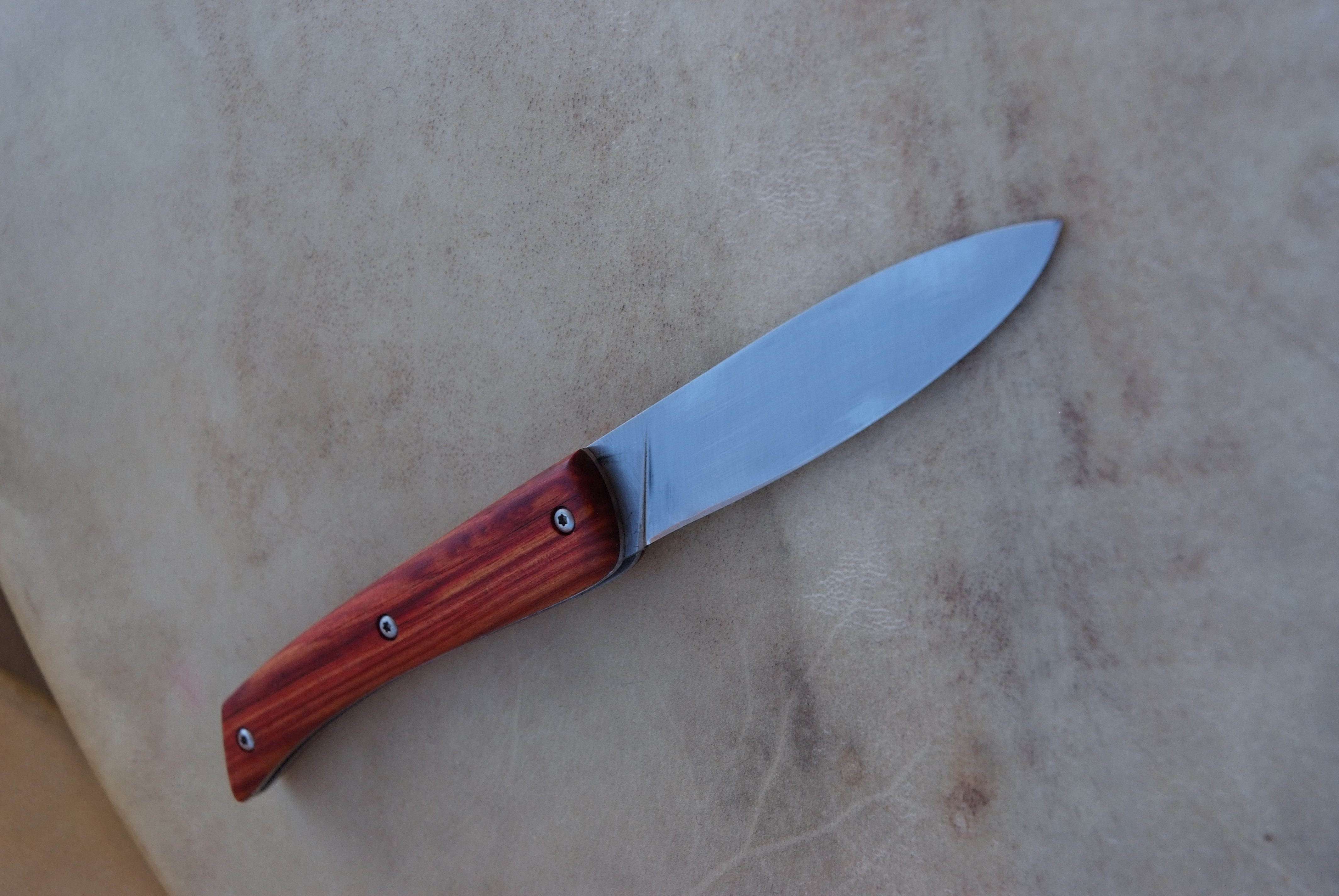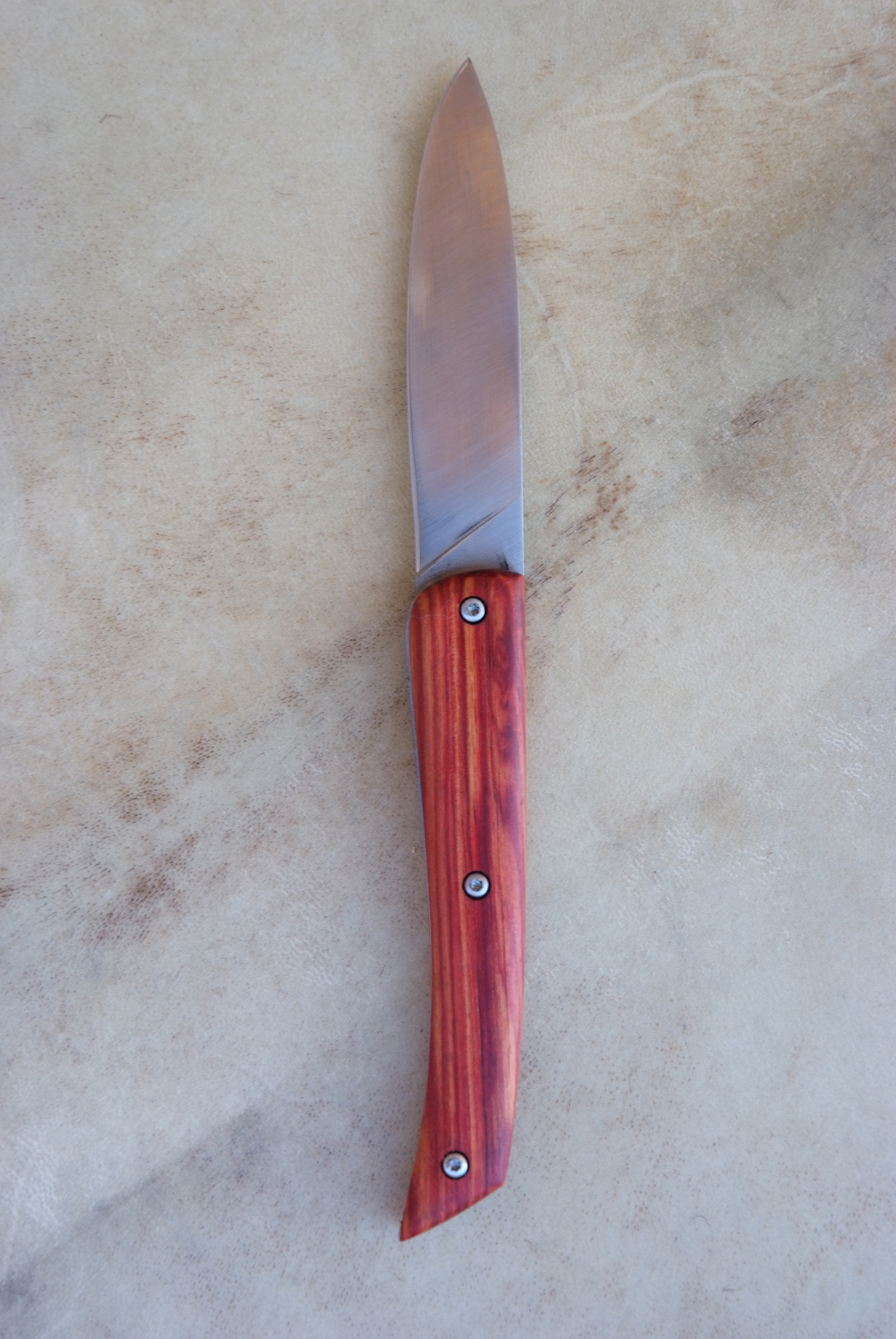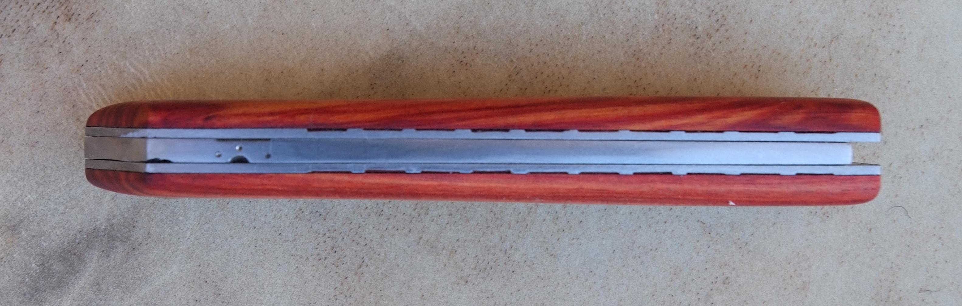 Lame 440A (requête spécial d’un acier doux et inox) – manche en bois de Rose – ressort inox – guillochage inca cranté.