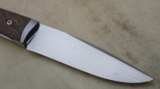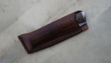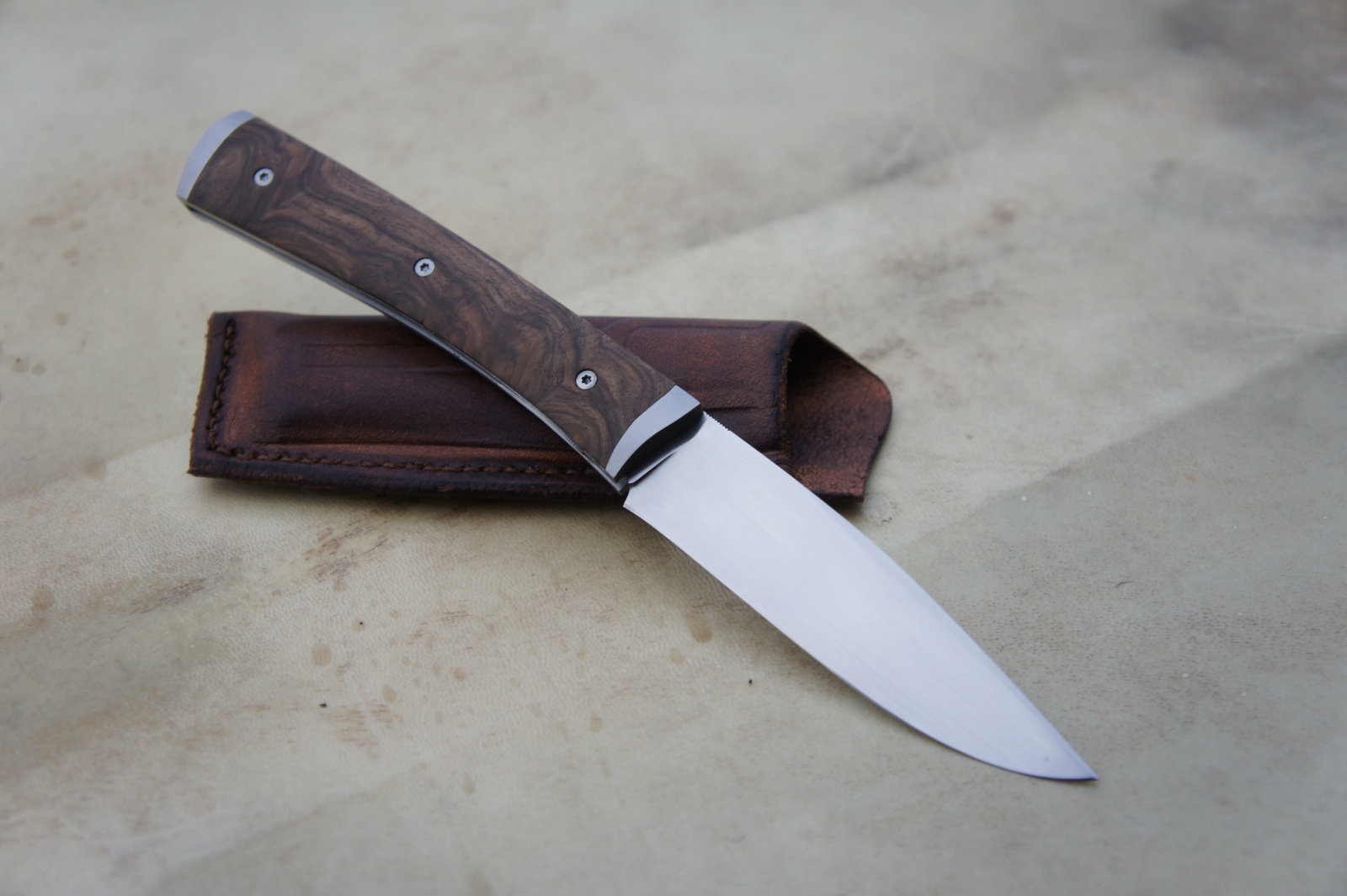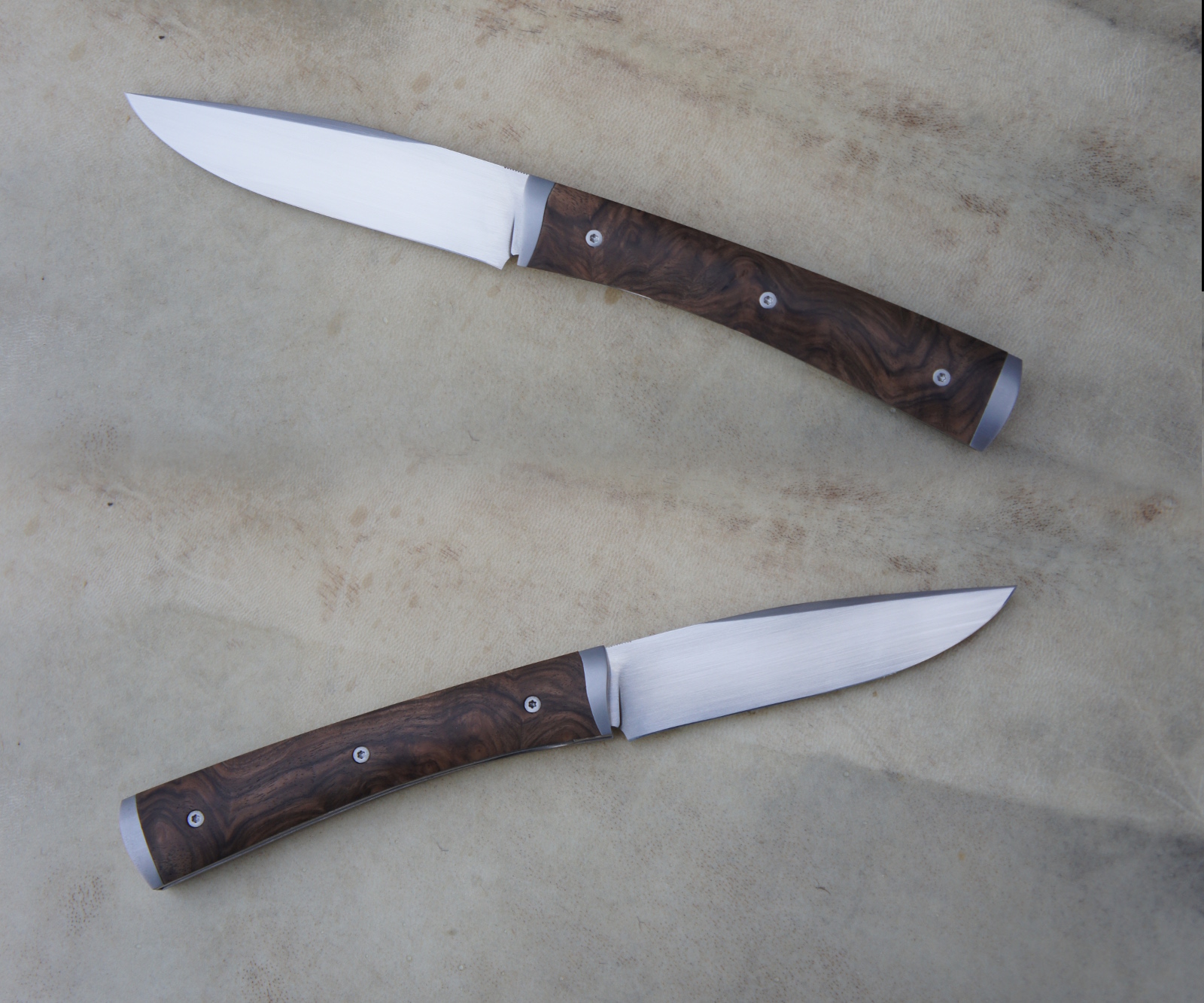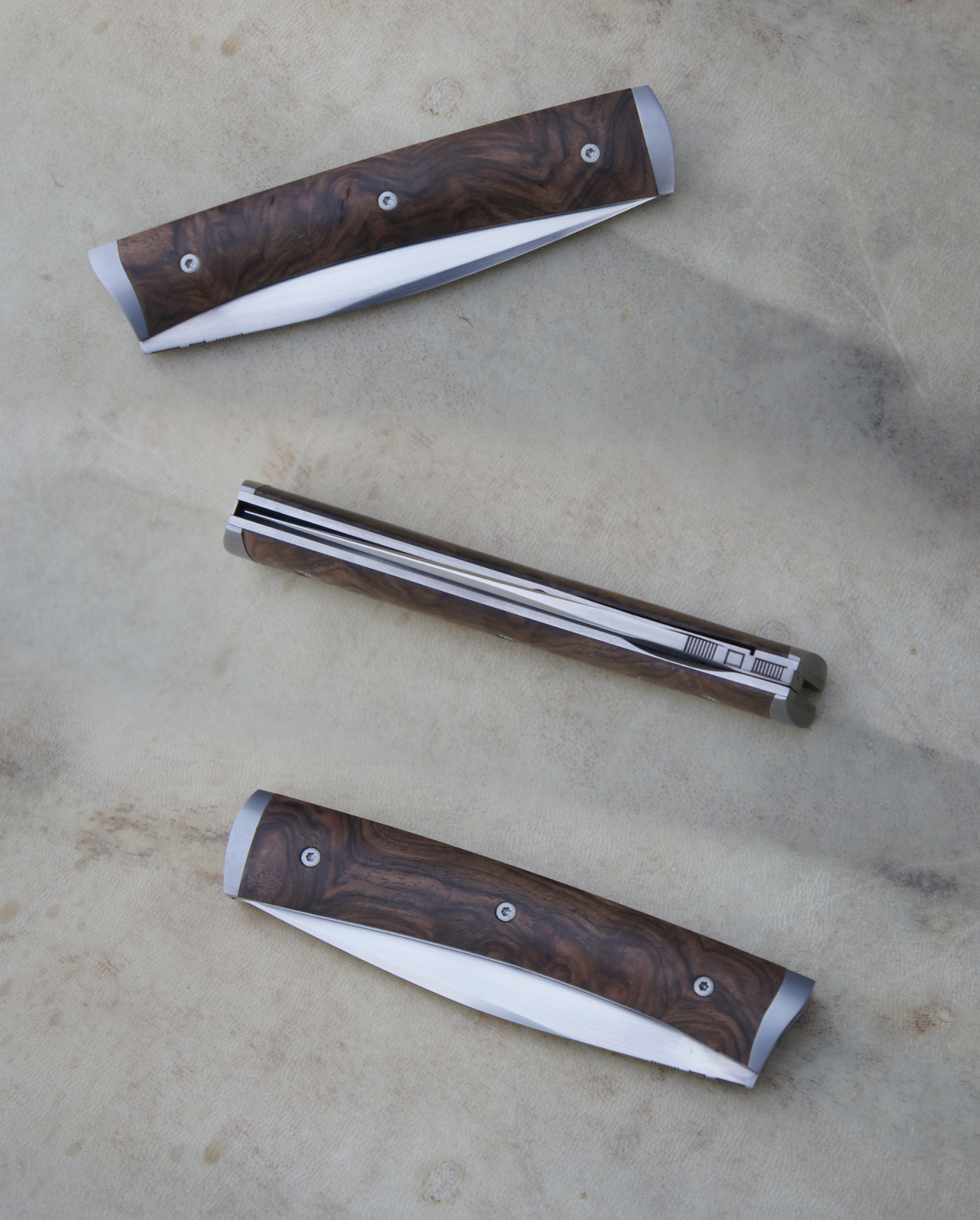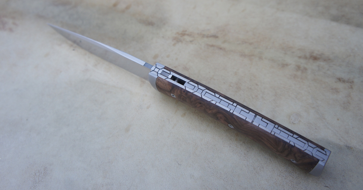 Lame inoxydable 14c28n – plaquettes loupe de noyer stabilisée – platines titane – guillochage – doubles mitres fines – étui cuir moulé