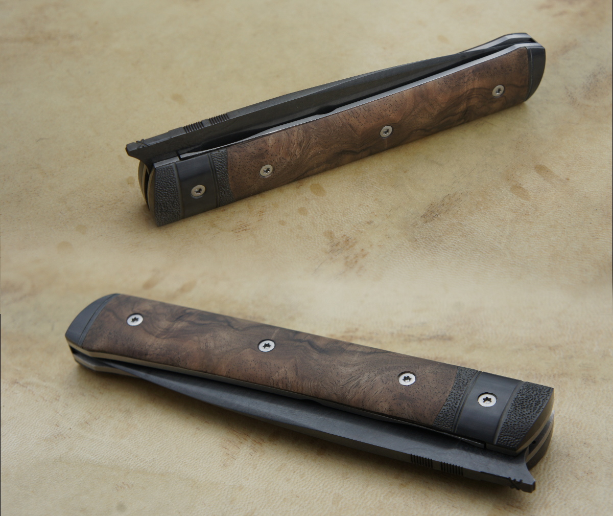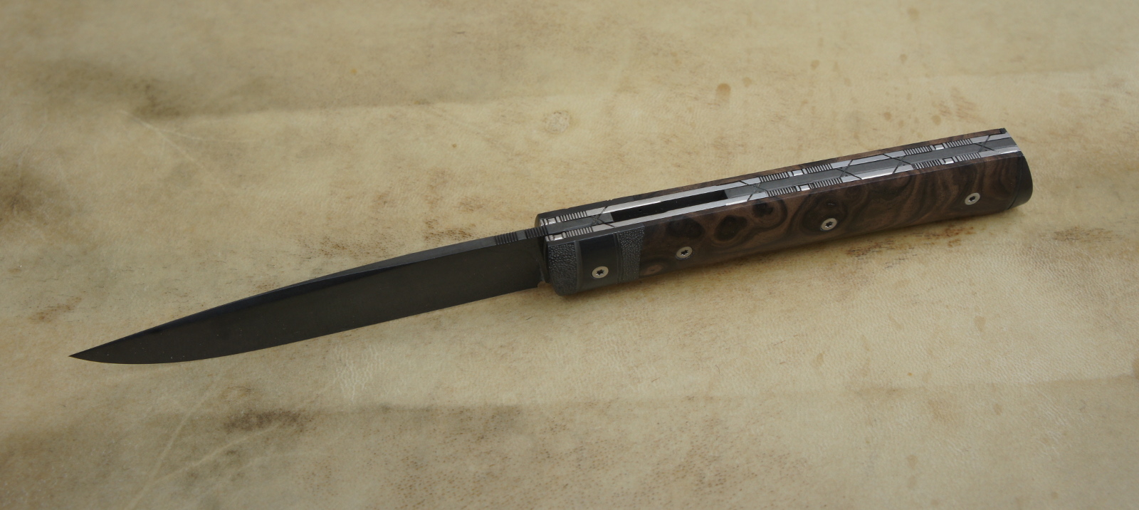 Lame 90MCV8 parkérisée – plaquettes loupe de noyer stabilisées – mitres XC75 parkérisée – platines titane – guillochage