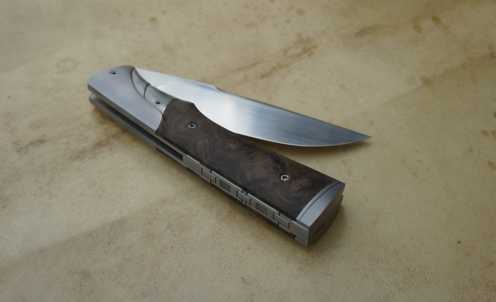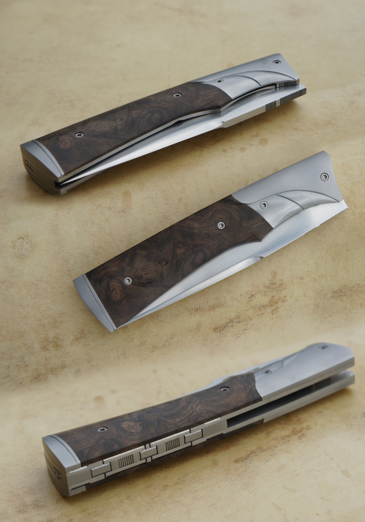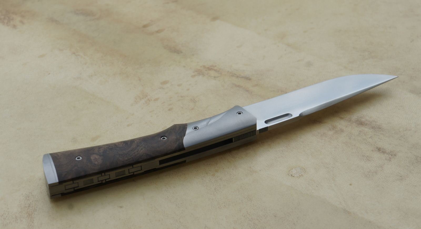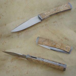 Lame inoxydable 14c28n – plaquettes loupe de noy er stabilisé – mitres – platines titane – guillochage