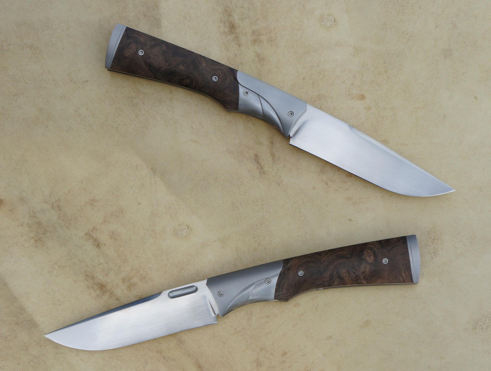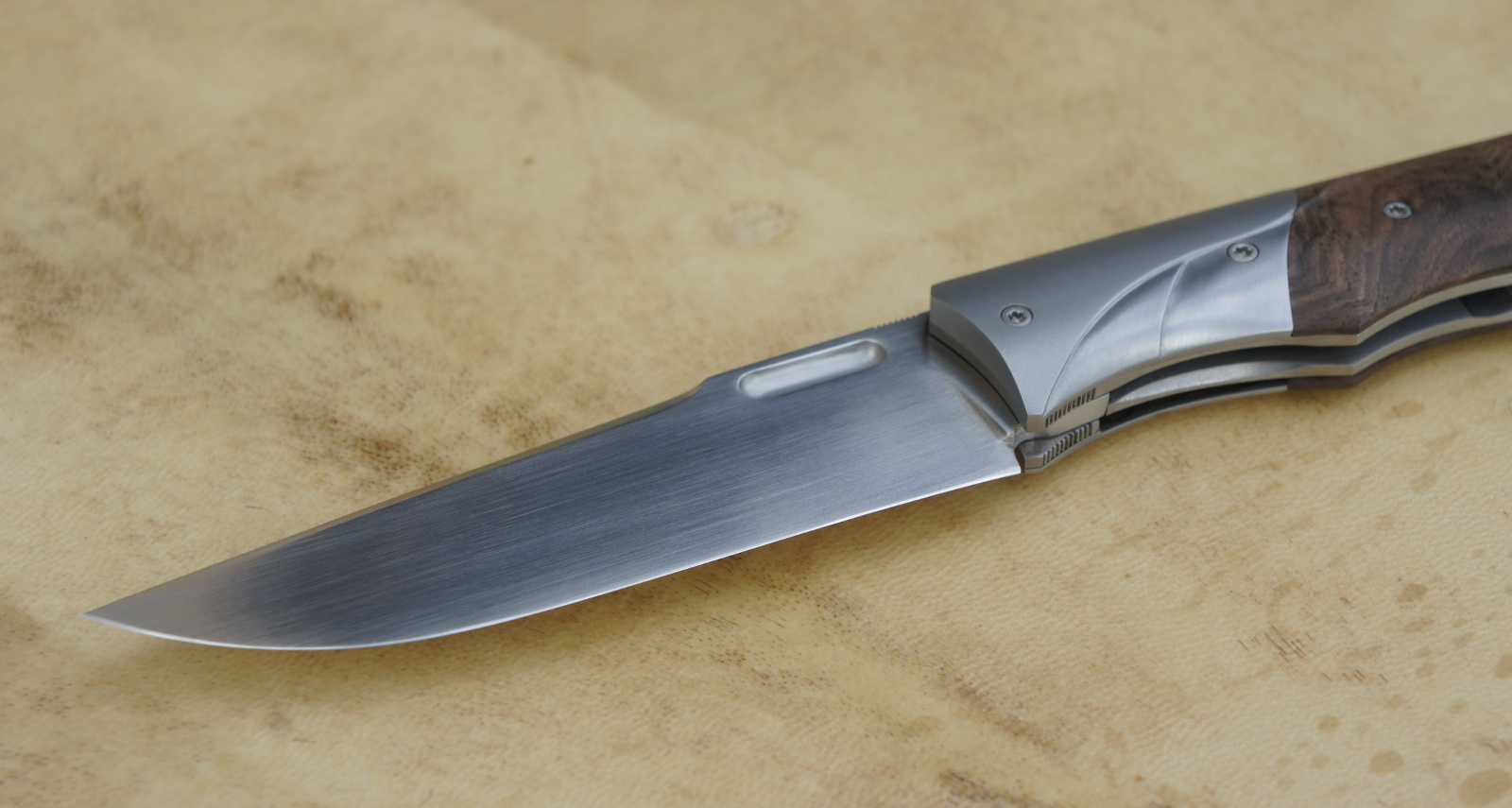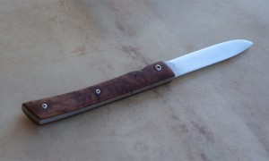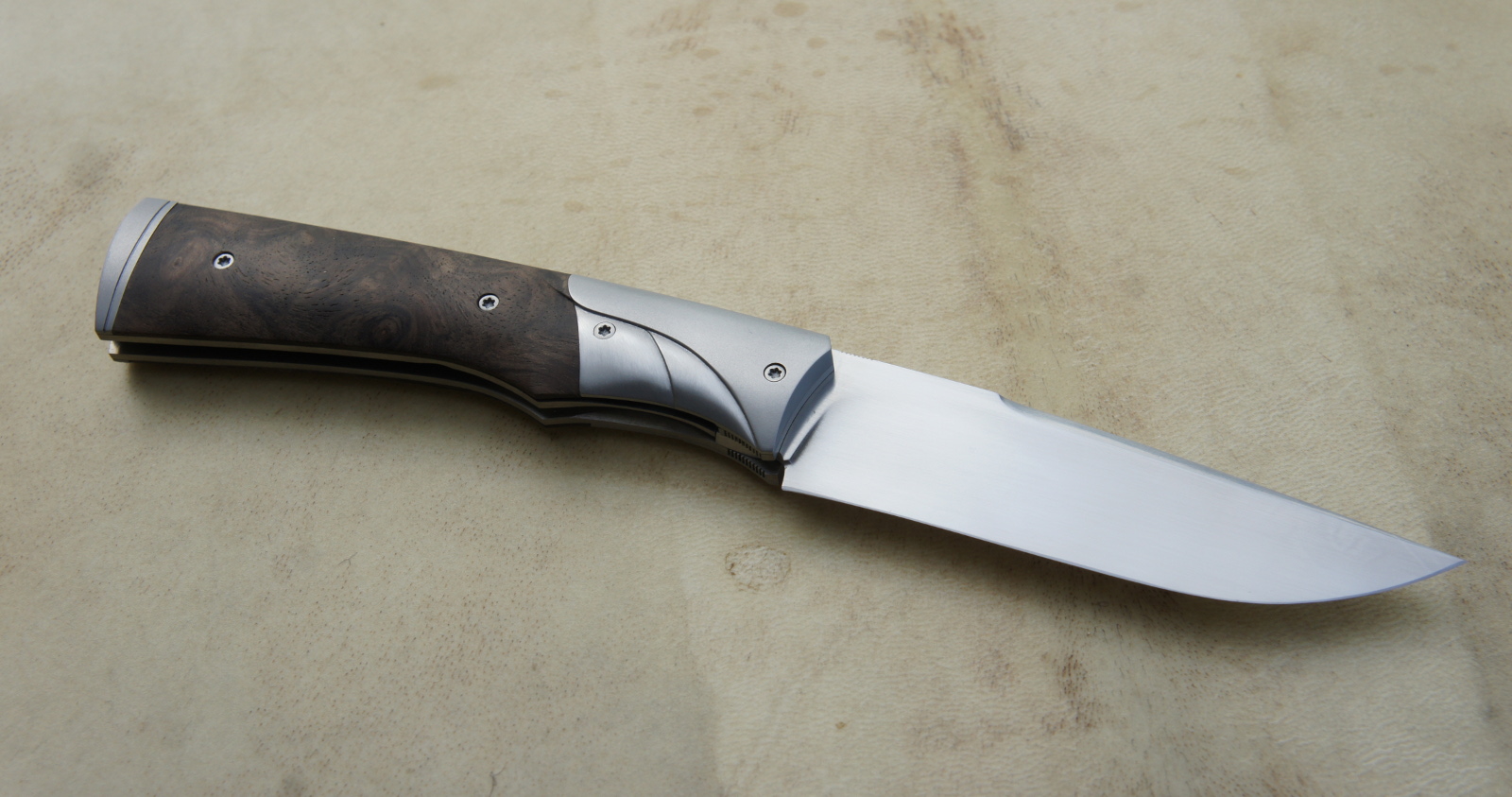 Lame inoxydable 14c28n – plaquettes loupe de noy er stabilisé – mitres – platines titane – guillochage