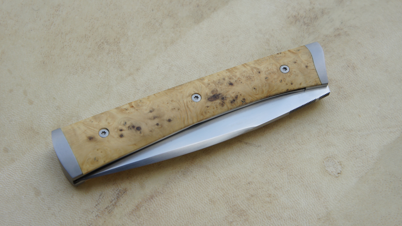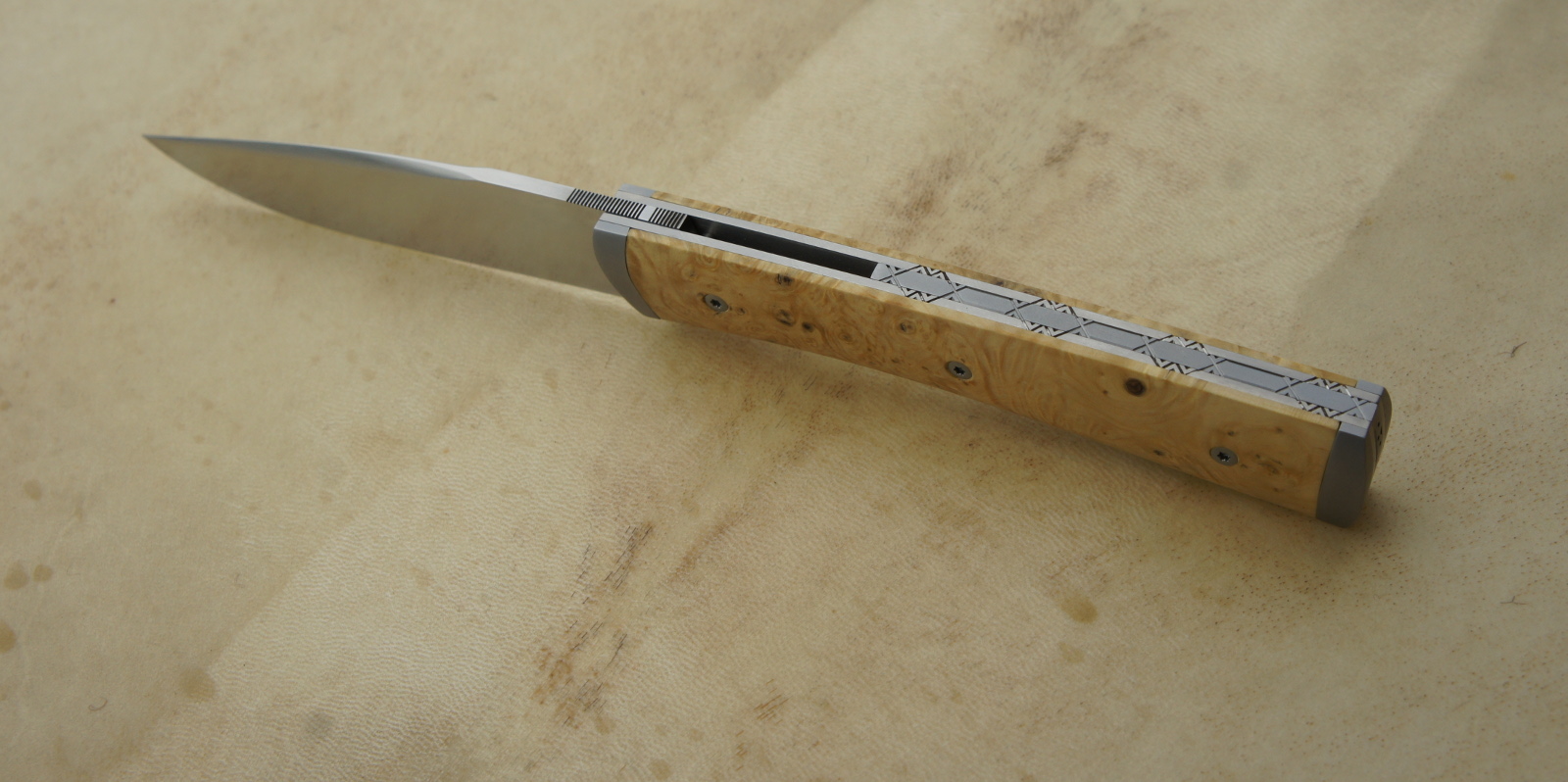 Guardian Loupe de Buis & 14c28n Mitres Fines Post author:cyrilka Post published:10 juillet 2017 Post category:Couteaux / Couteaux pliants / Guardian Post comments:0 commentaire Couteau pliant de type liner lock. Lame inoxydable 14c28n – plaquettes loupe de buis – mitres fines – platines titane – guillochage Longueur de lame : 9,5 cm. Longueur totale : 20,7 cm. Poids : 82 grs. Tags: 14c28n, artisanal, chenailler, chenailler mascheix, corrèze, couteau, coutellerie, cyril kalisz, demontable, guardian, guillochage, inox, inoxydable, kalisz, Liner lock, loupe de buis, mascheix, mitres fines, stablisée Read more articles Article précédentGuardian Buis & 125SC trempe sélective parkérisée Article suivantGuardian 125SC & Bois de Fer – passe lacet Vous devriez également aimer Treyssac -S- Niolox et Amboine 23 février 2015 P’tit PlanKa 24 février 2011 Treyssac Fusion 115W8 & bois de cerf 14 mars 2019 Laisser un commentaire Annuler la réponseCommentEnter your name or username to comment Enter your email address to comment Enter your website URL (optional) Enregistrer mon nom, mon e-mail et mon site dans le navigateur pour mon prochain commentaire. Je m'inscrit à la liste d'informations Δ Ce site utilise Akismet pour réduire les indésirables. En savoir plus sur comment les données de vos commentaires sont utilisées.