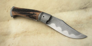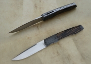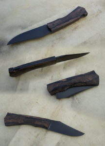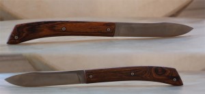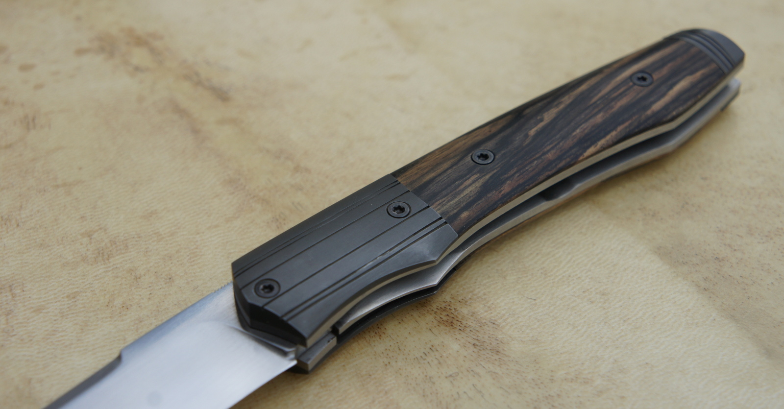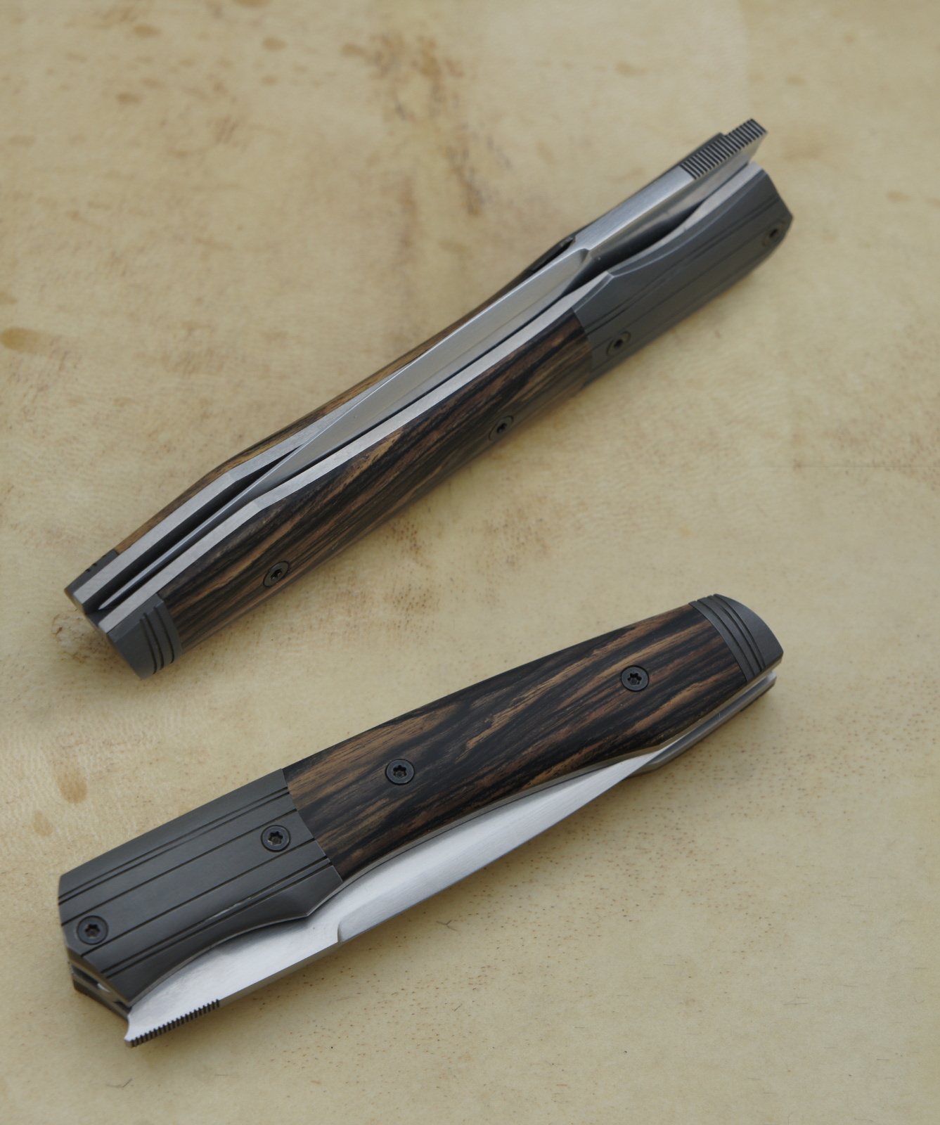 Lame inoxydable 14c28n – mitres parkérisées – plaquettes ébène royal du Laos – platines titane – guillochage