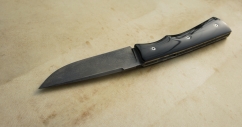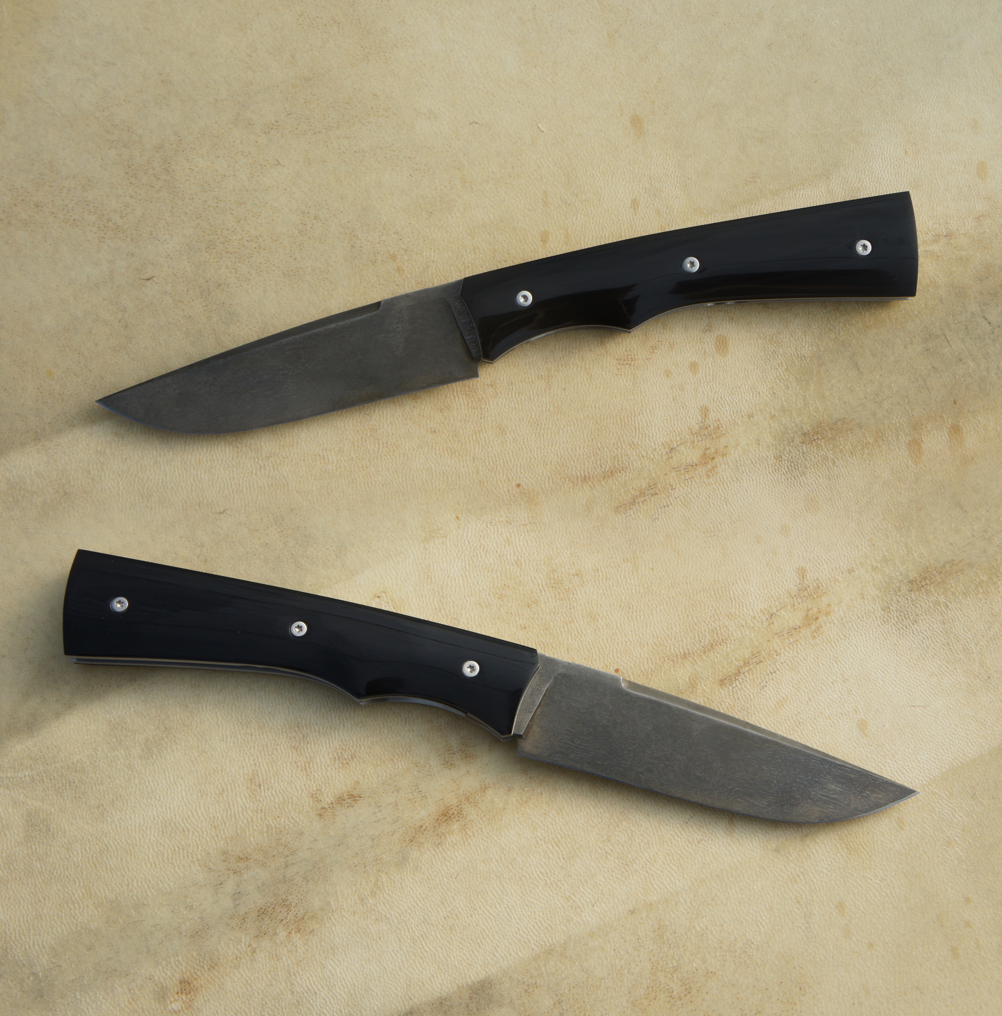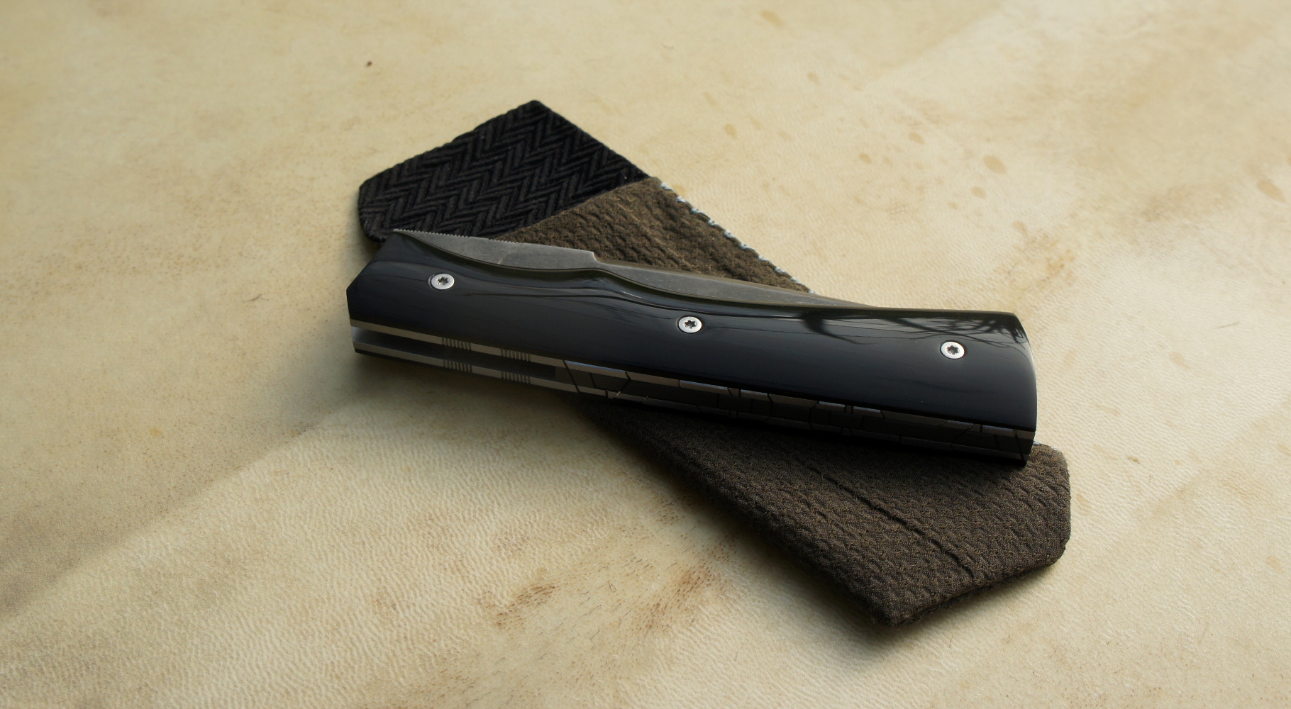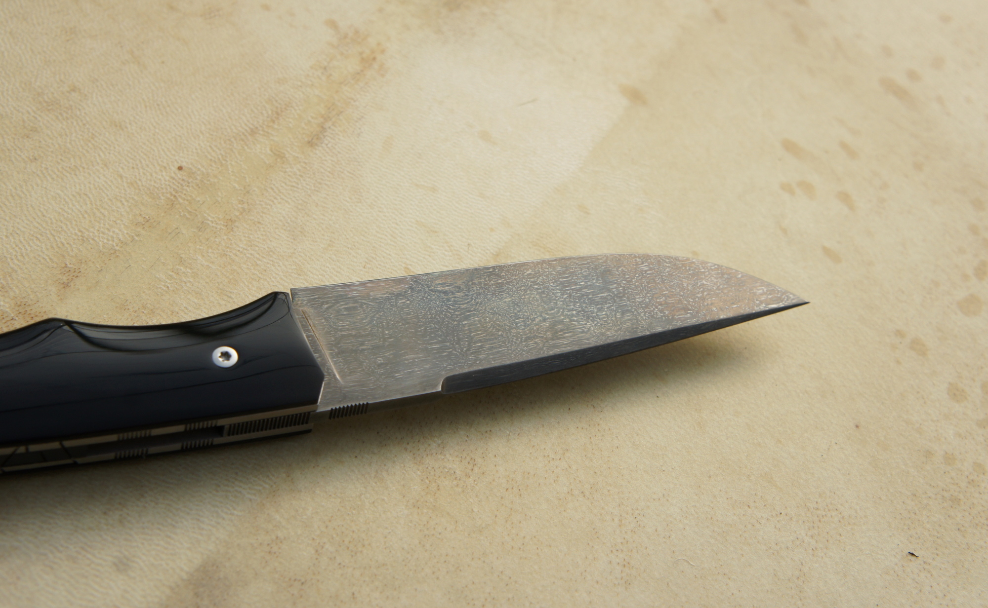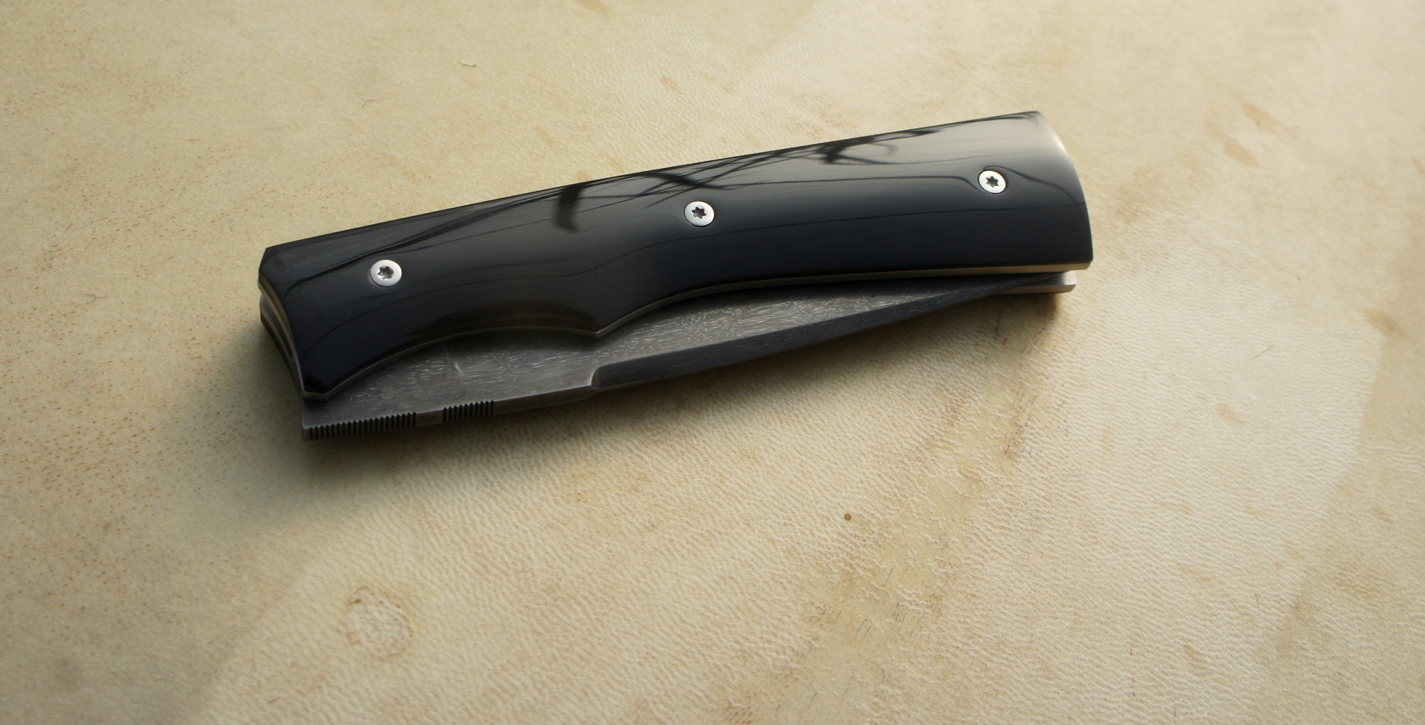 Lame carbone wootz 1.5% de carbone C de Evrahim Baran – plaquettes corne de buffle noire – platines titane – guillochage