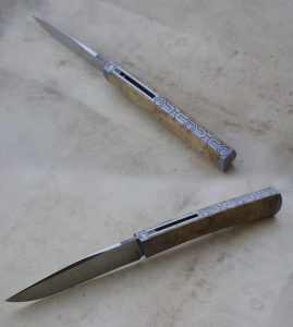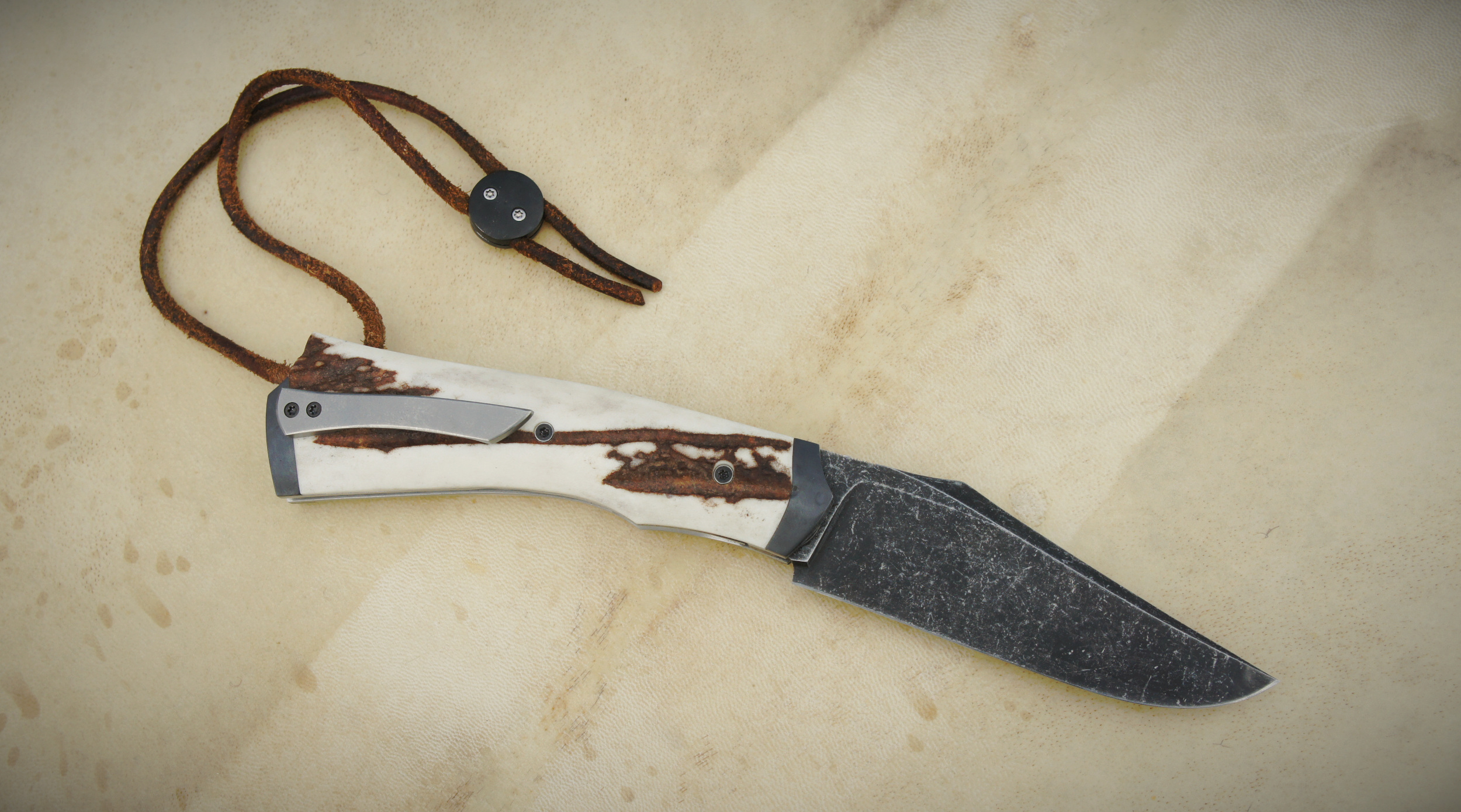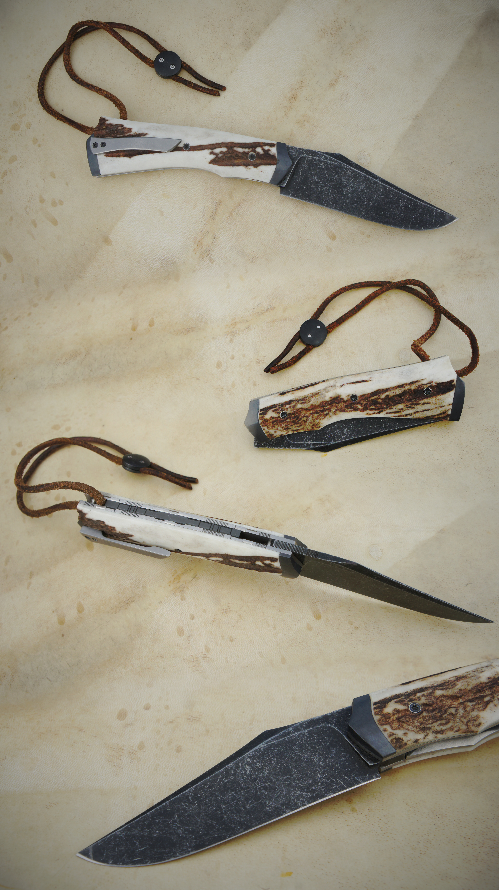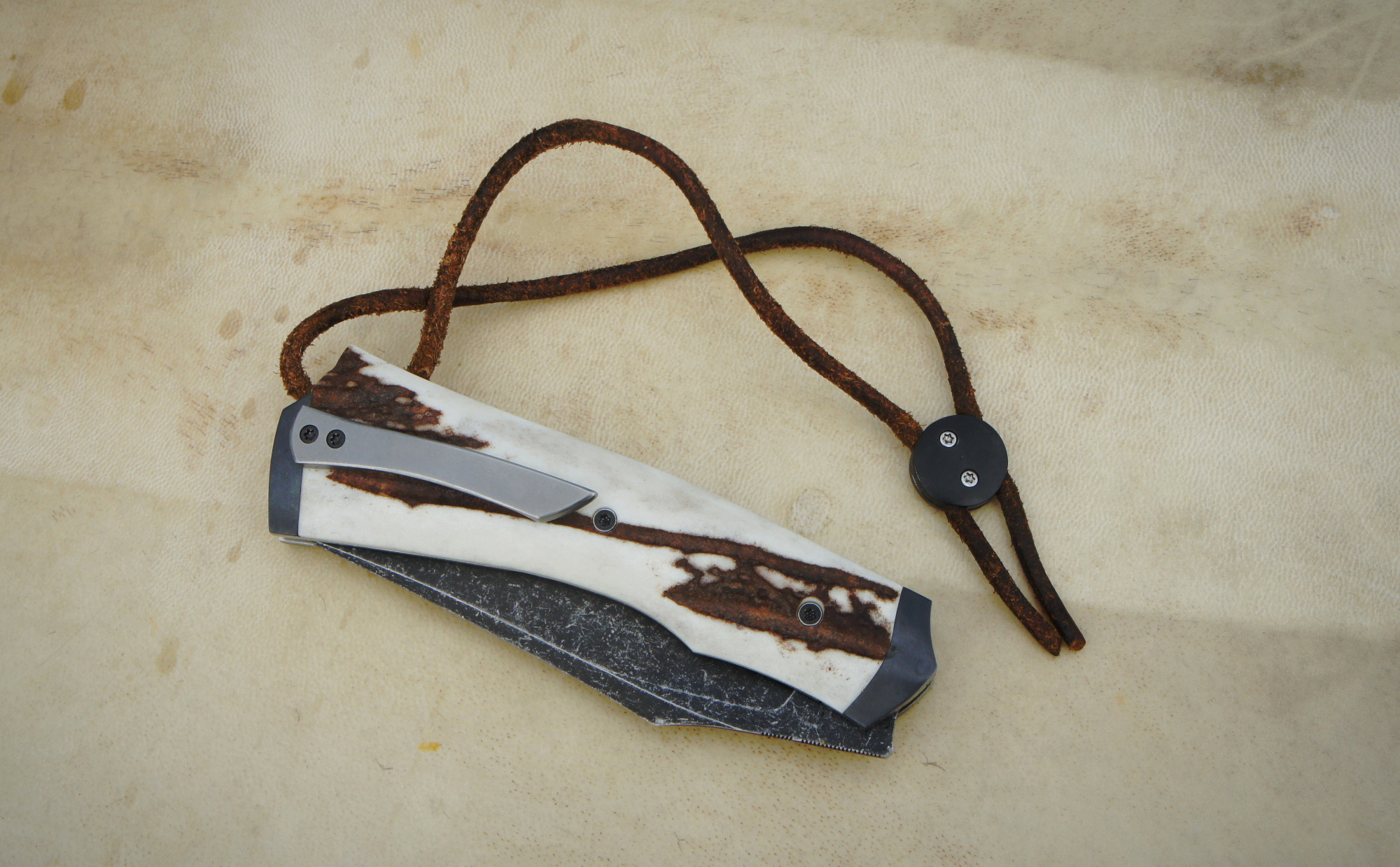 Lame carbone 115W8 – plaquettes bois de cerf – platines titane – mitres fines – guillochage – parkérisation – stonewashed – stop-cable – clip-ceinture